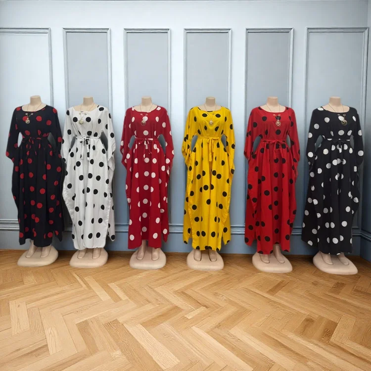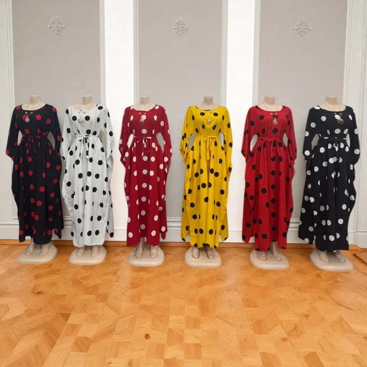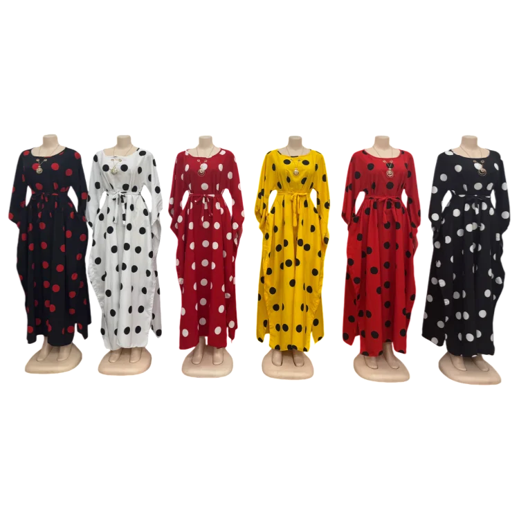 Summer Retro High Waist Midi Ladies Wholesale Long Sleeve Round Neck a Line Polka Dot Dress