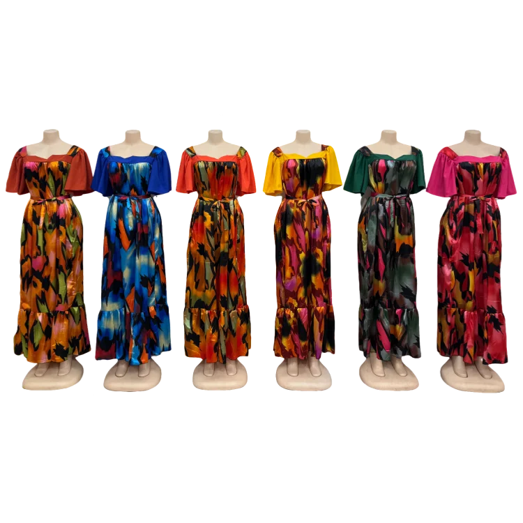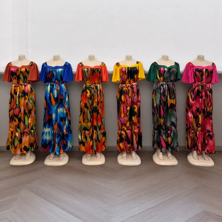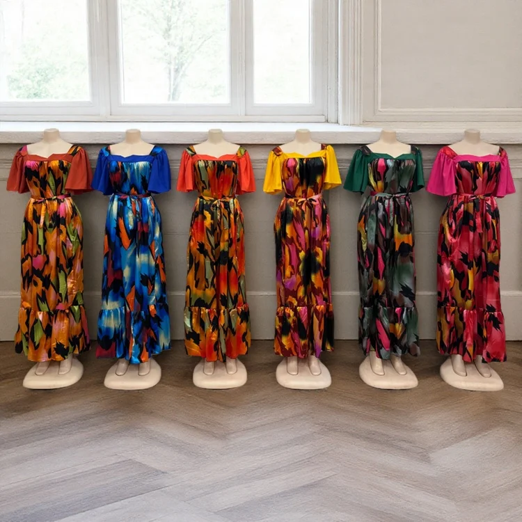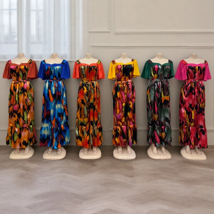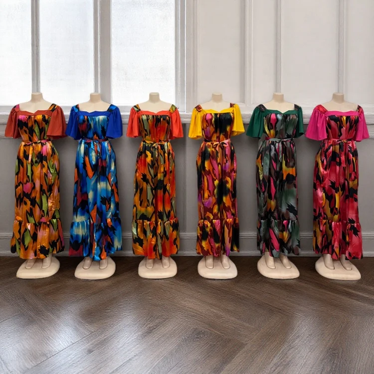 Wholesale New Ladies Print Casual Short Sleeve Belt Fashion square Collar Breathable Dress