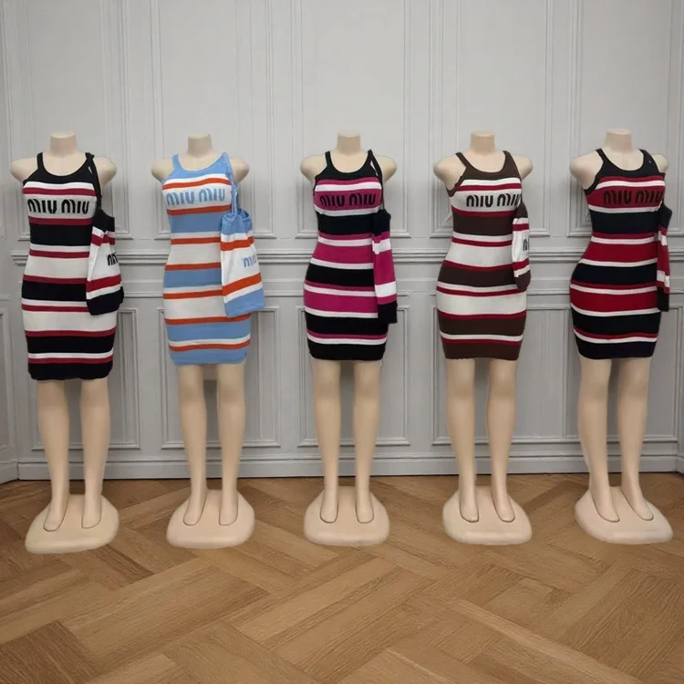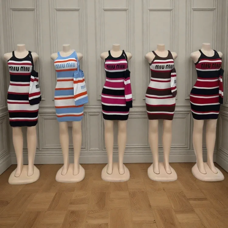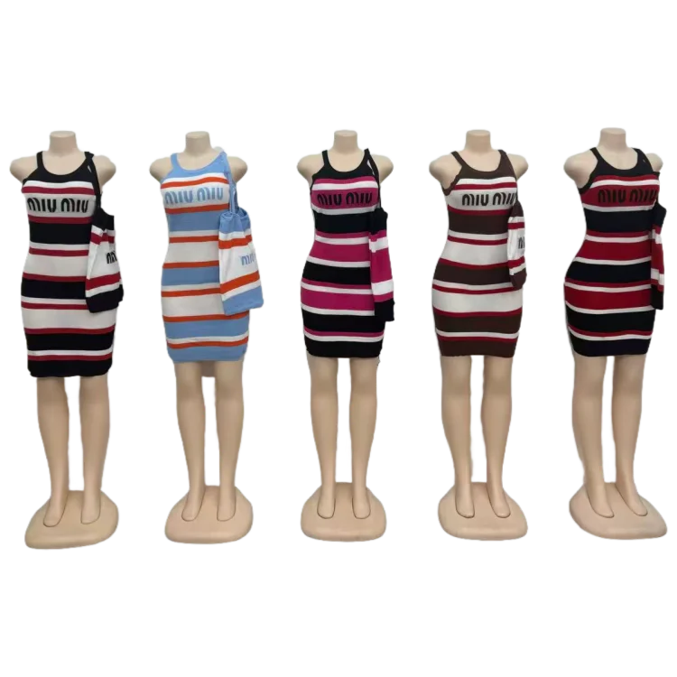 New Summer Fashion Women Shoulder Bag Stitching Color Matching Striped Sleeveless Sheath Dress