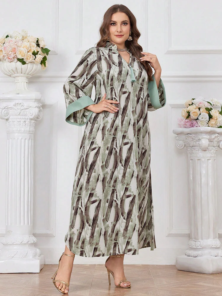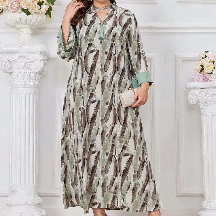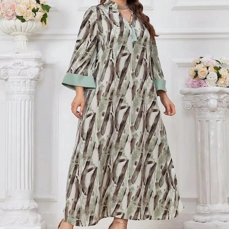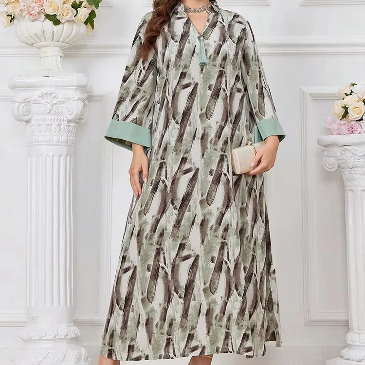 New Middle Eastern Muslim Robe Fashion Printed Loose Large Size Long Sleeve V-neck Dress