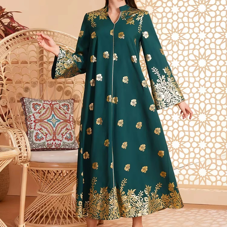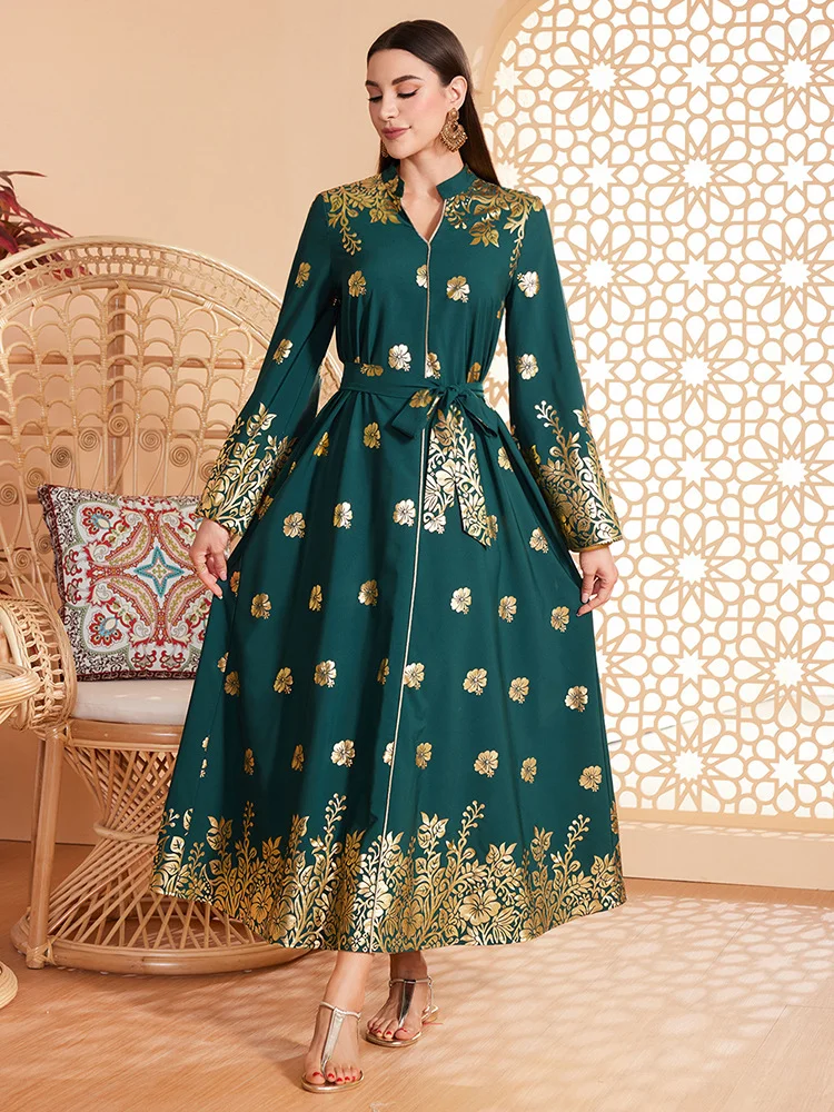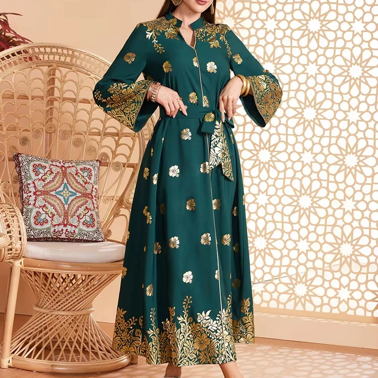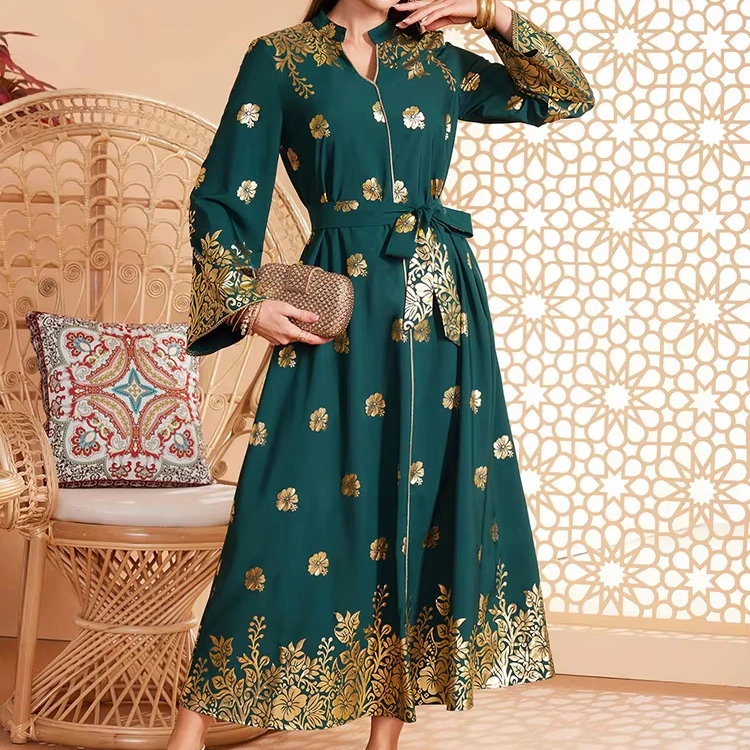 Wholesale New Middle East Fashion V-neck Muslim Robe Bronzing Long Sleeve Belt Dress