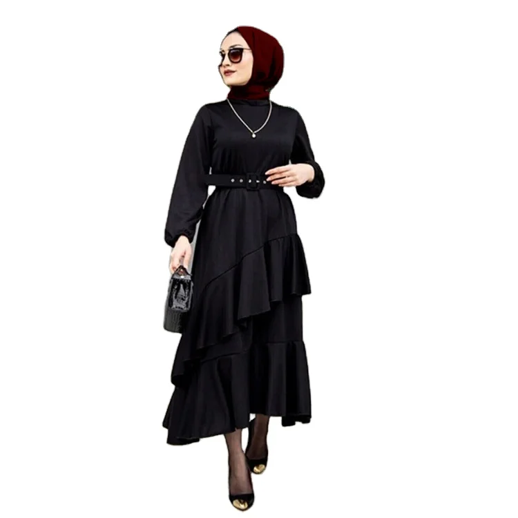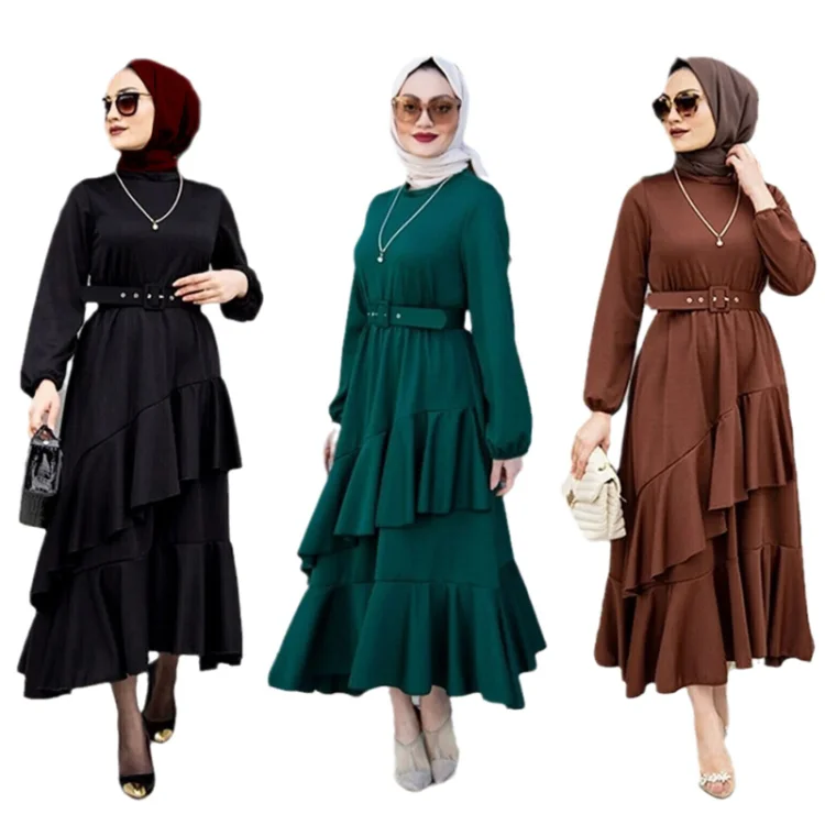 Wholesale Middle Eastern Muslim Women Robe Double Layer Ruffled Tunic Long Sleeve Dress