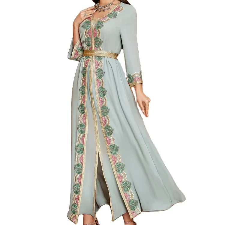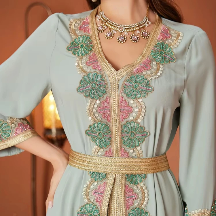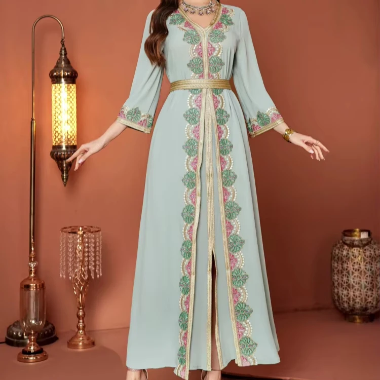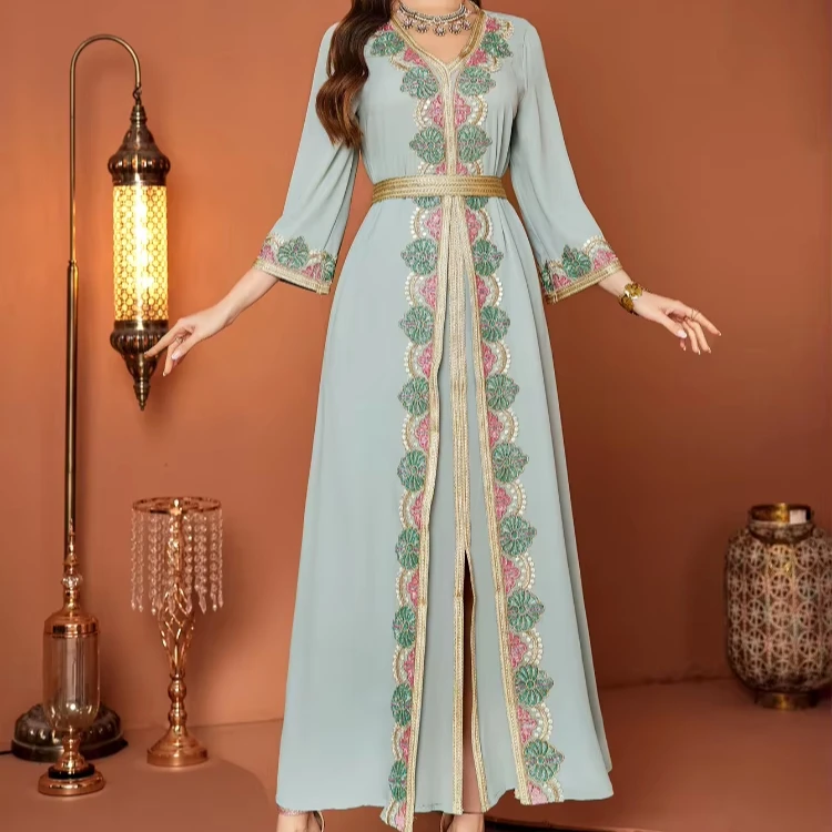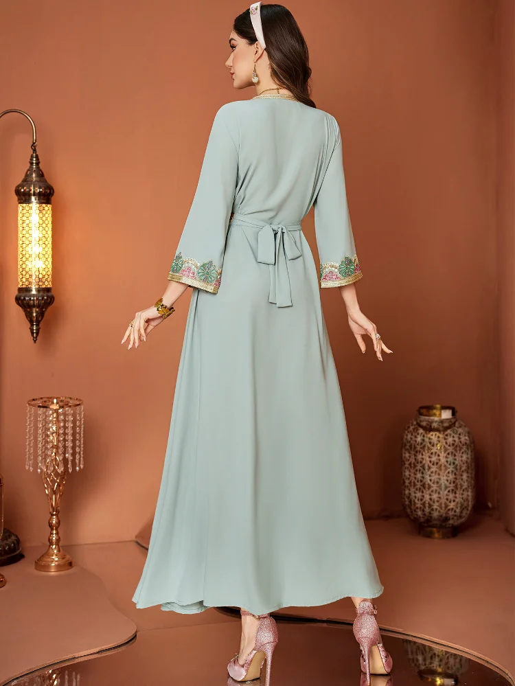 New Muslim Women's Robe Stitching Lace Embroidery Nail Drill Lace V-Neck Long Sleeve Dress
