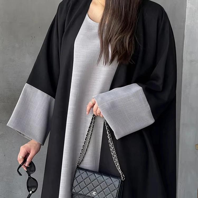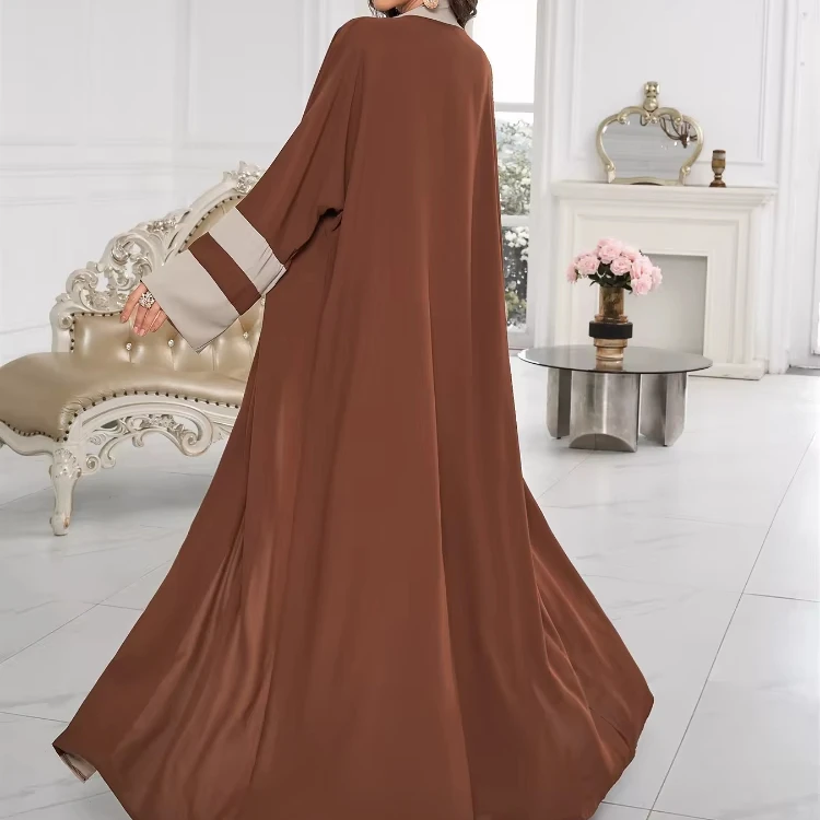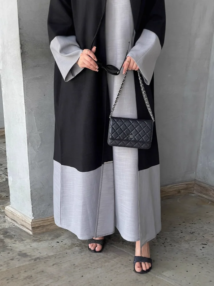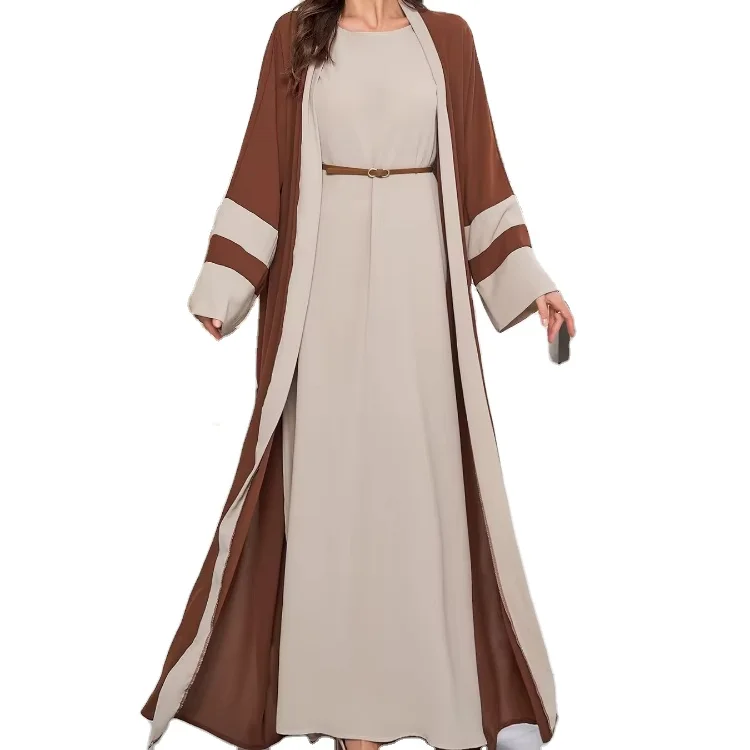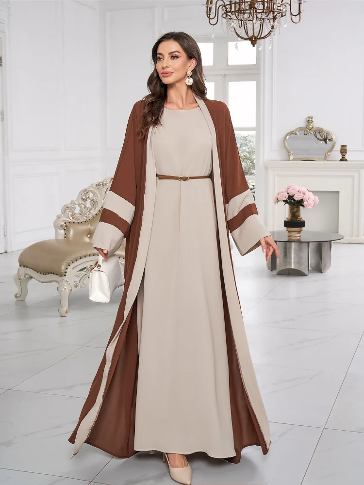 Middle East Muslim Robe Striped Contrast Long Sleeve Cardigan Spring New Elegant Loose Dress