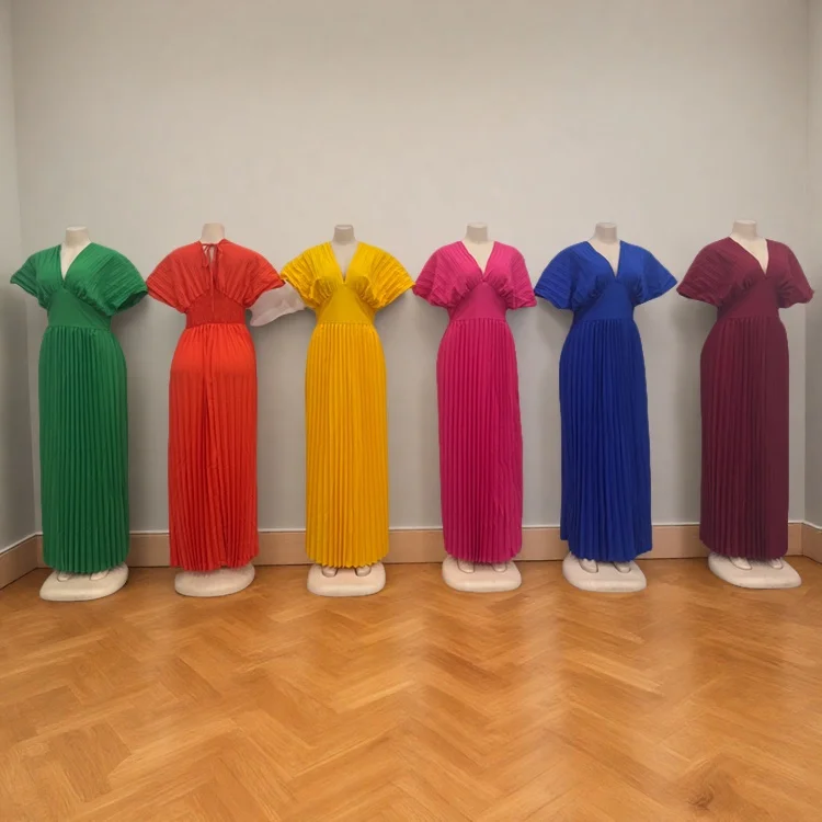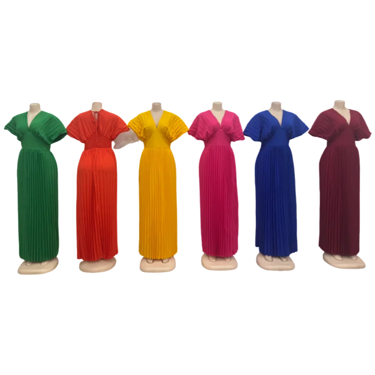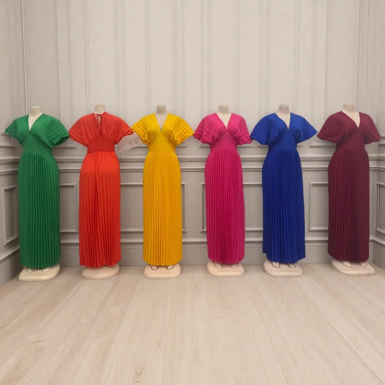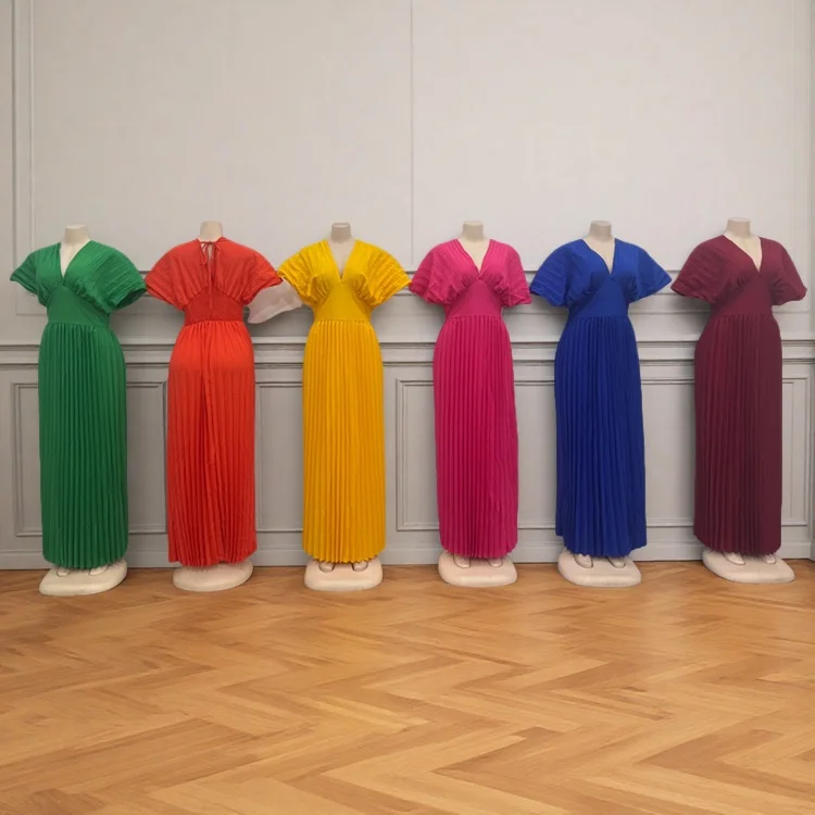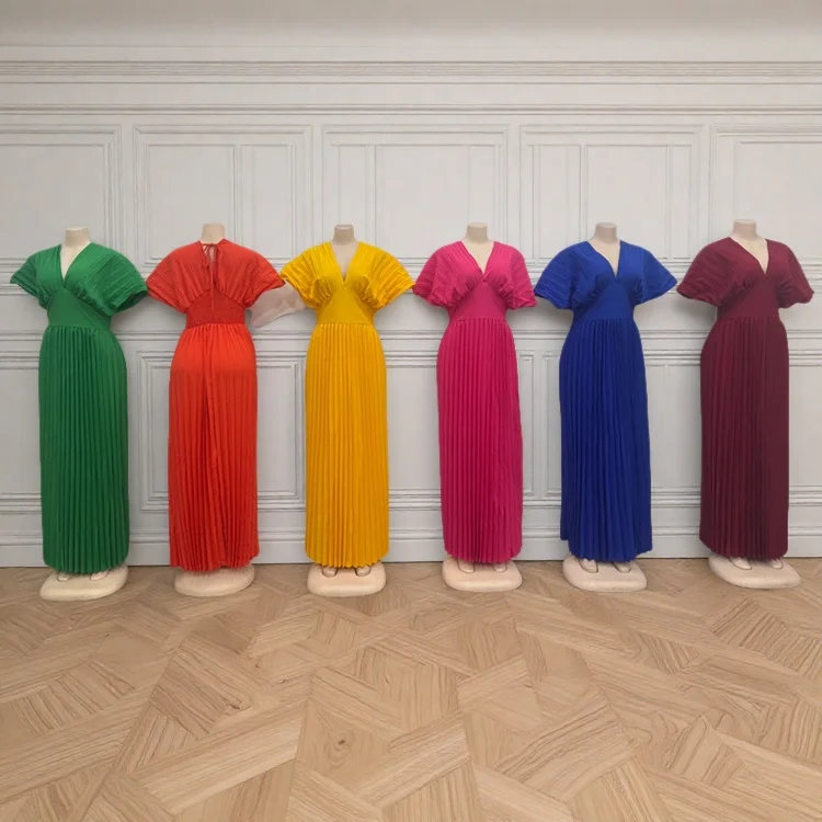 Wholesale Summer European and American Style Solid Color V-neck Bat Sleeve High Waist Women's Dress