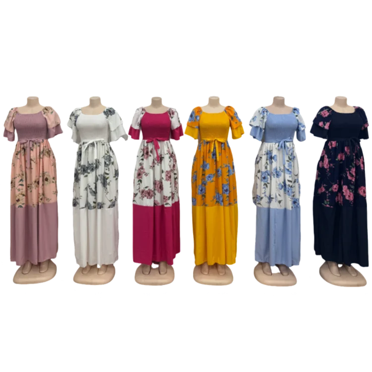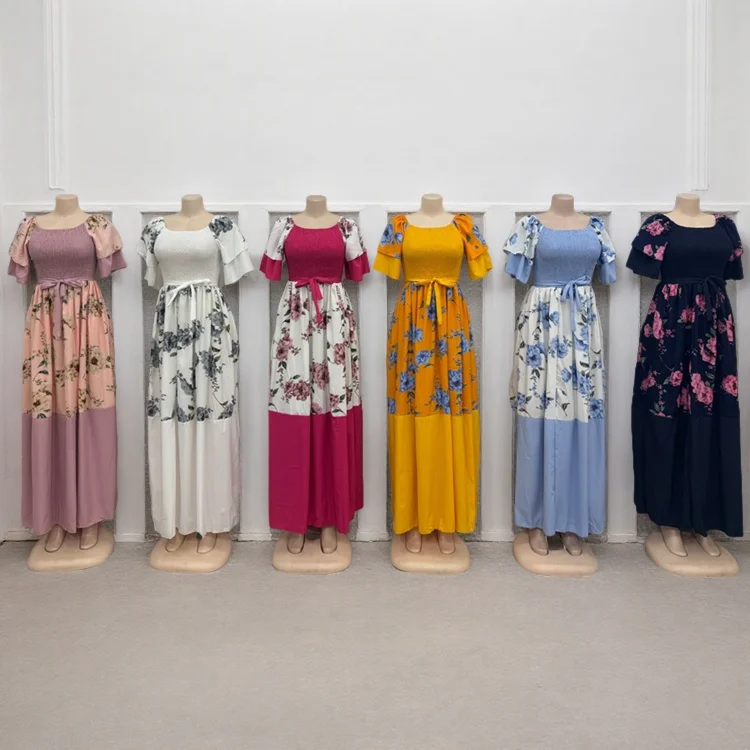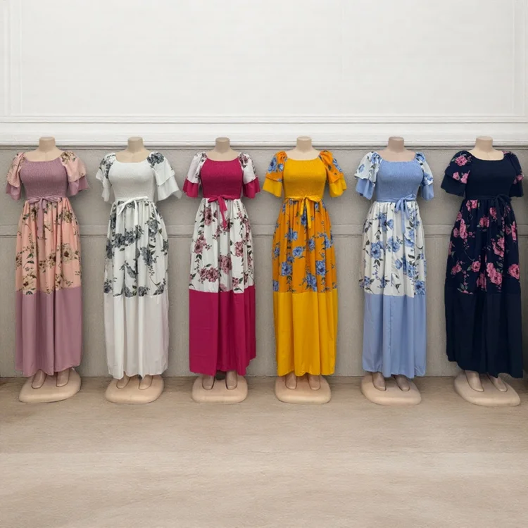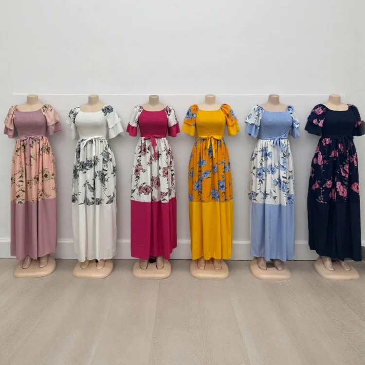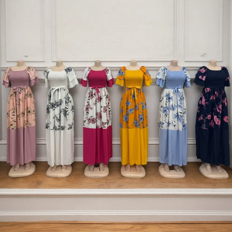 New Wholesale Vintage Printing Round Neck Short Sleeve Stitching Women's Summer Slim Fit a Line Dress