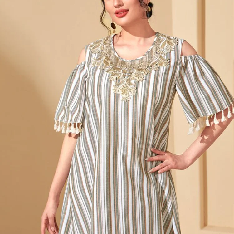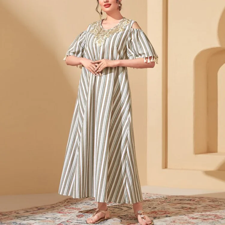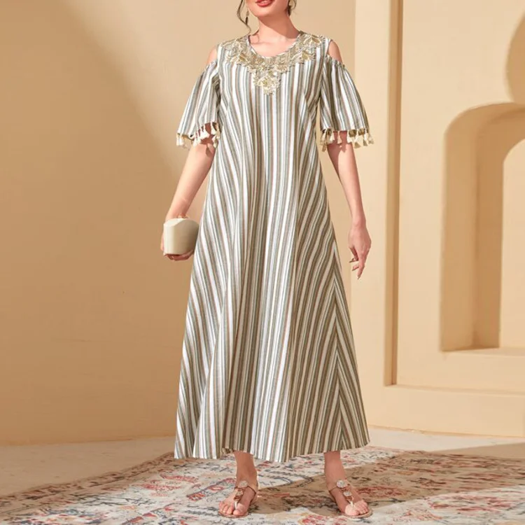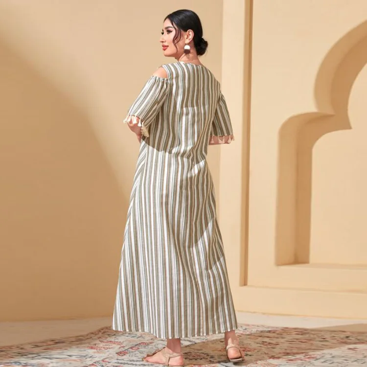 Middle East New Women Spring Striped Muslim Robe Tassel Short Sleeve Loose High Waist Dress
