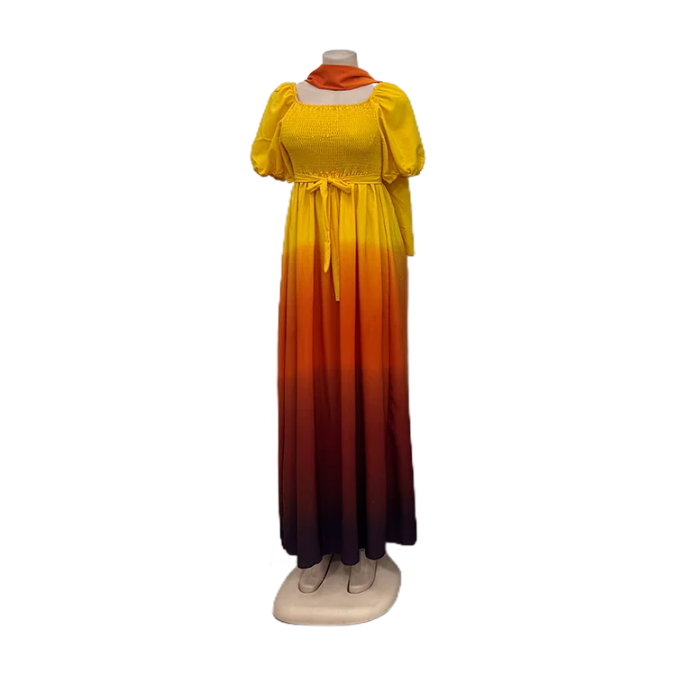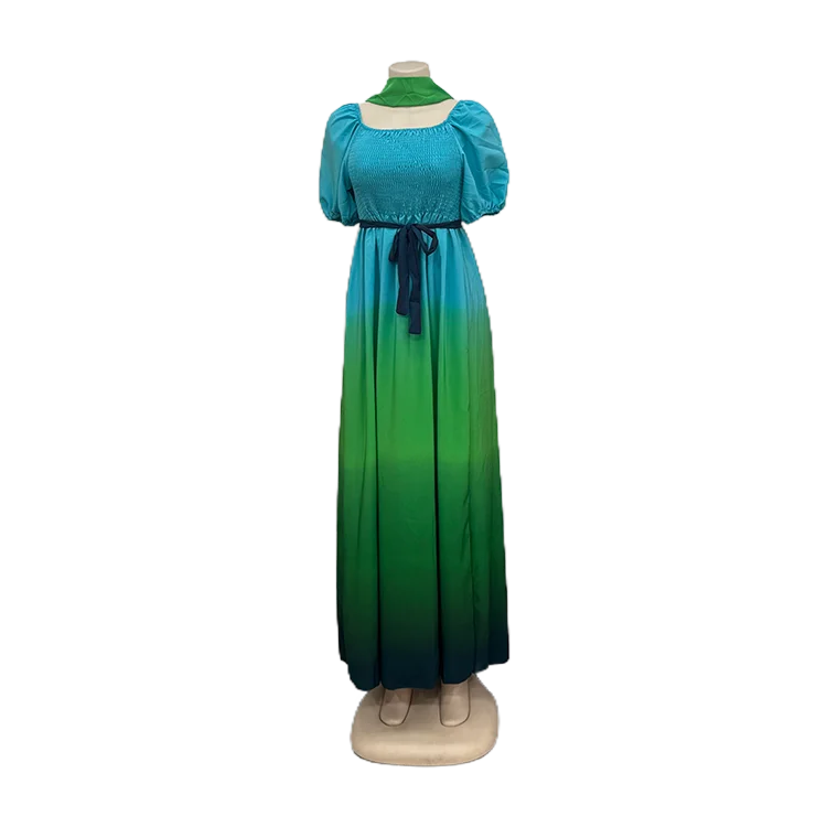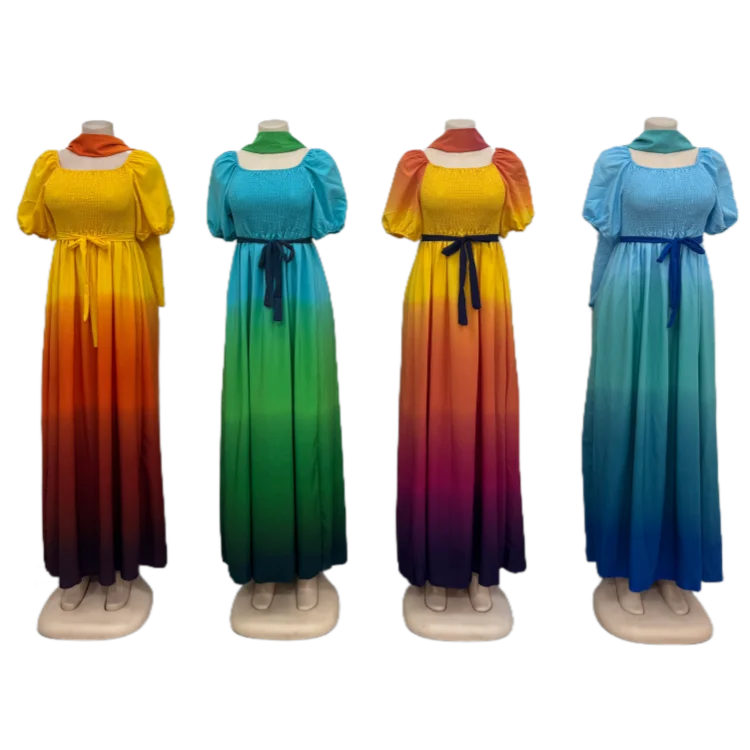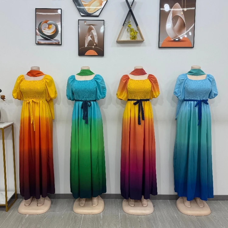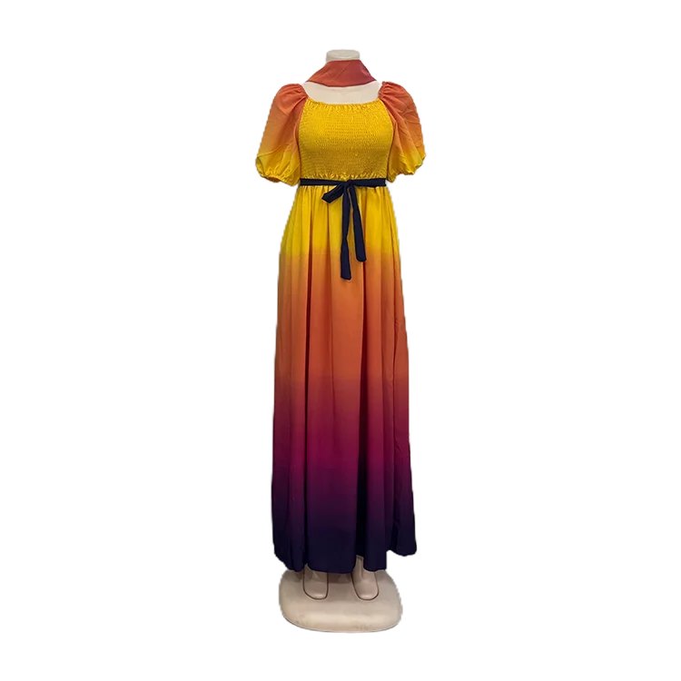 Summer New Casual Women's Pleated Skirt Gradient Color Layered Ruffles Loose Elegant Short-Sleeved Dress