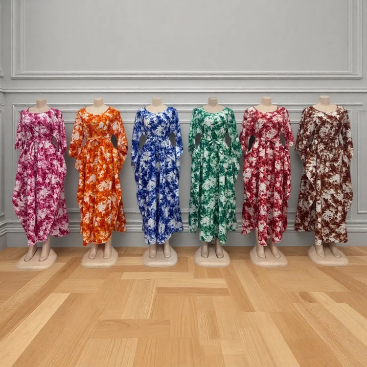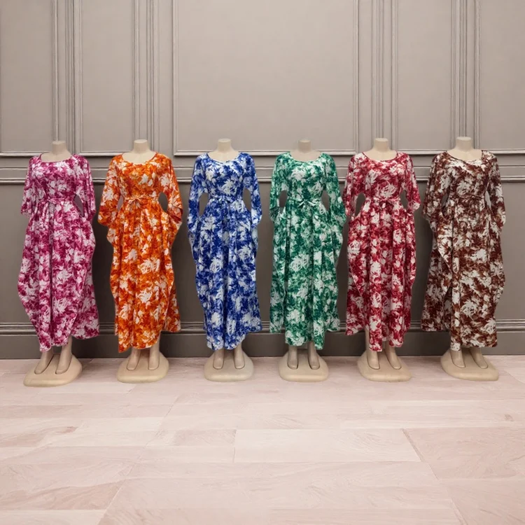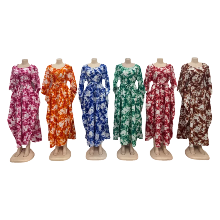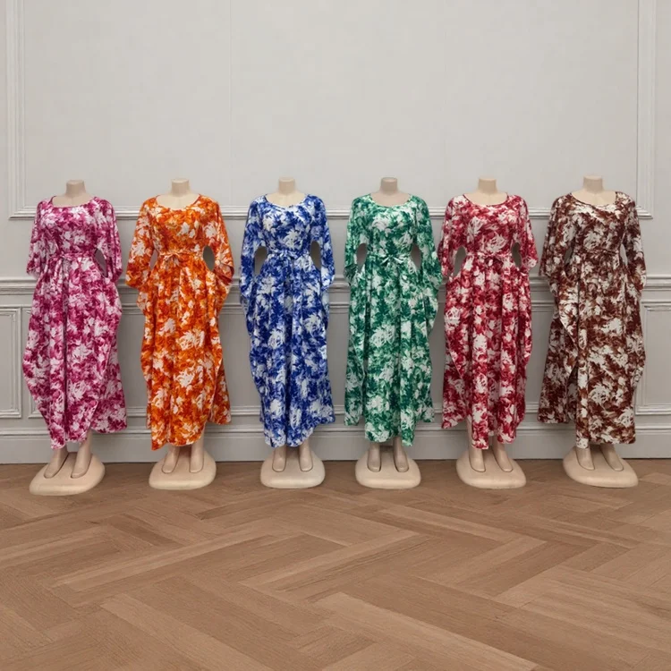 Wholesale New Plus Size African Women's Summer Crewneck Belted Waist Long Sleeve Printed Dress