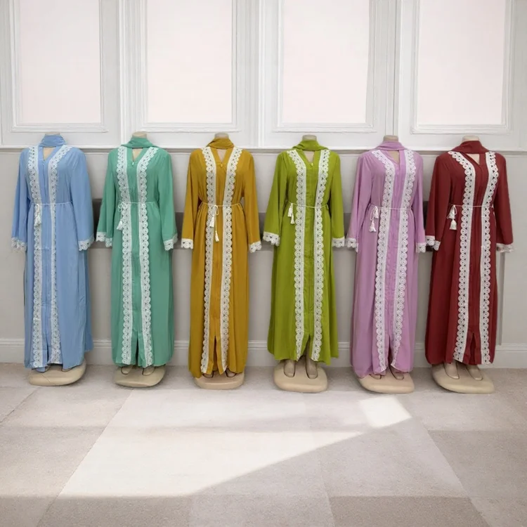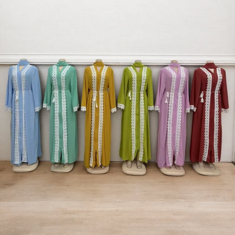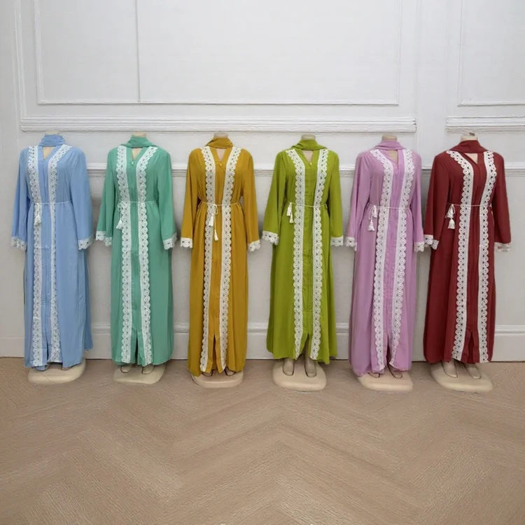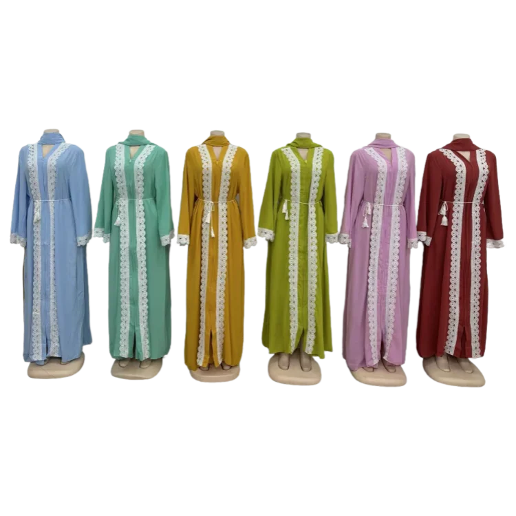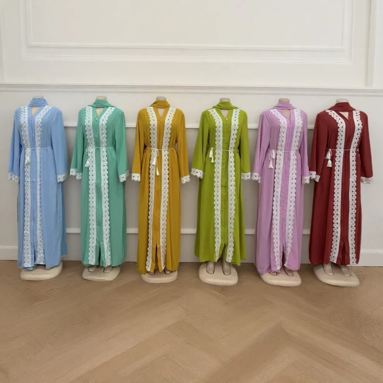 New Fashion Solid Color Zipper V-neck Lace Loose Long Sleeve Women African Muslim Robe