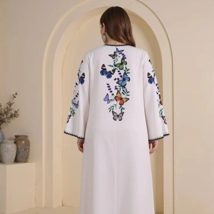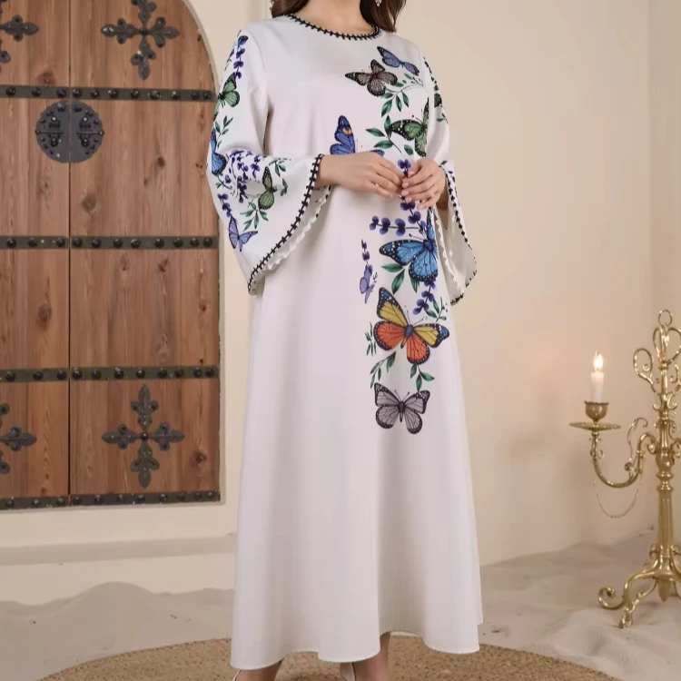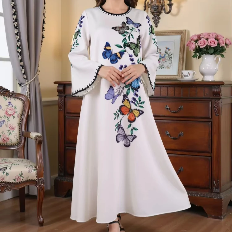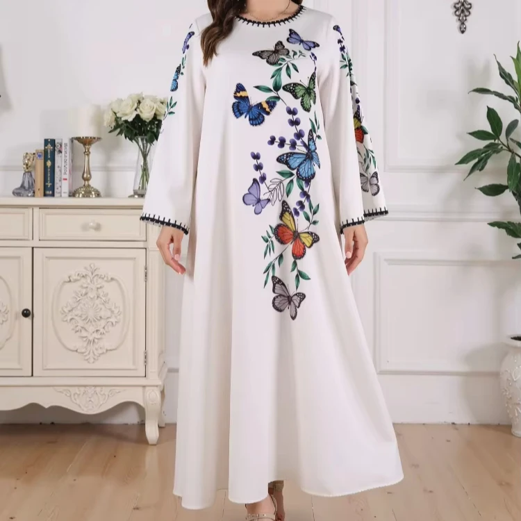 Custom Middle East New Printed Hot Rhinestone Women Robe Muslim Long Sleeve Round Neck Dress