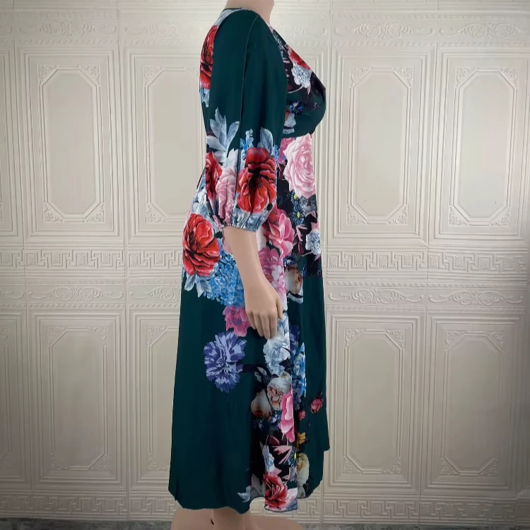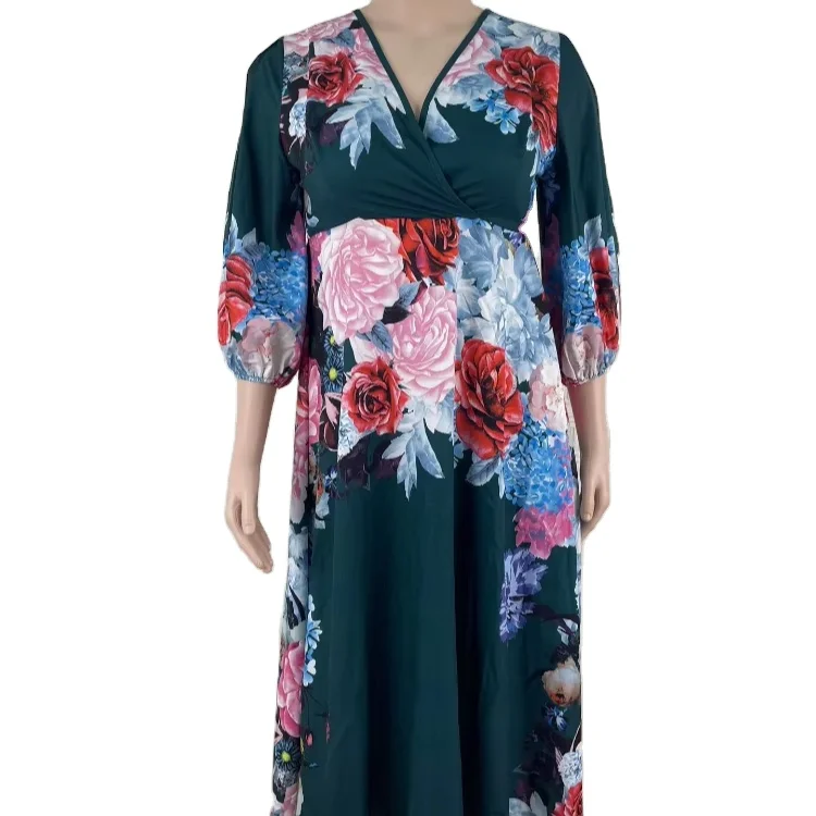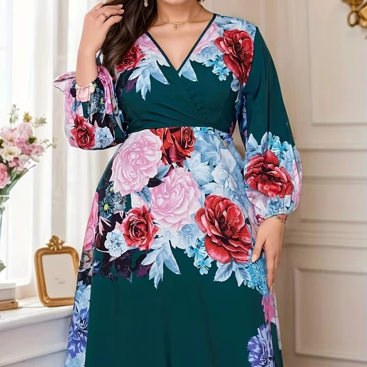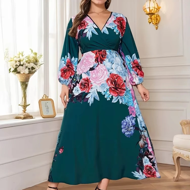 Middle Eastern Muslim Women Robe Abaya Fashion Floral Print Plus Size Long Sleeve V-Neck Dress