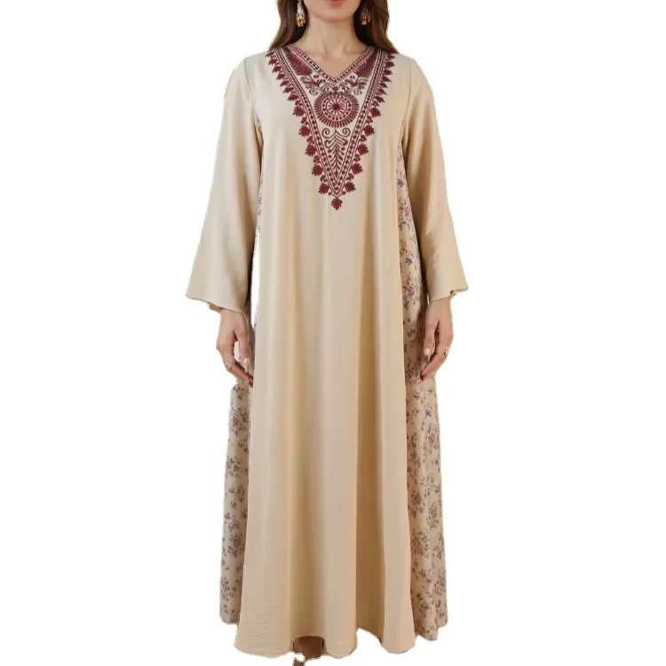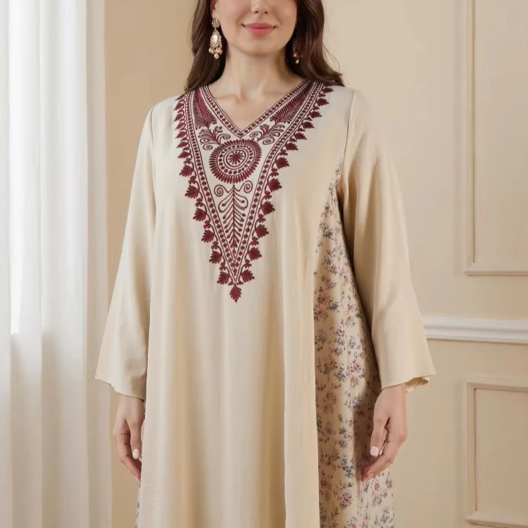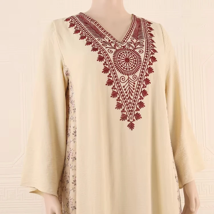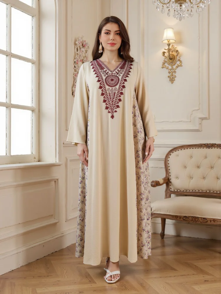 Women's Fashion New Muslim Embroidery Printed Robe Middle East Vintage Dress Long Sleeve Dress