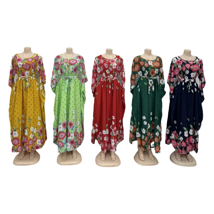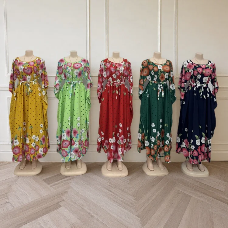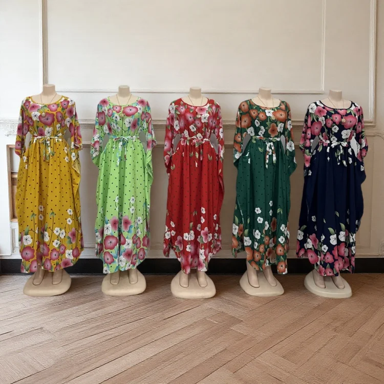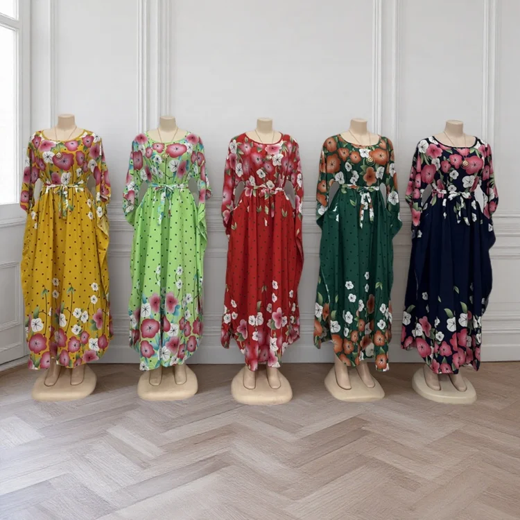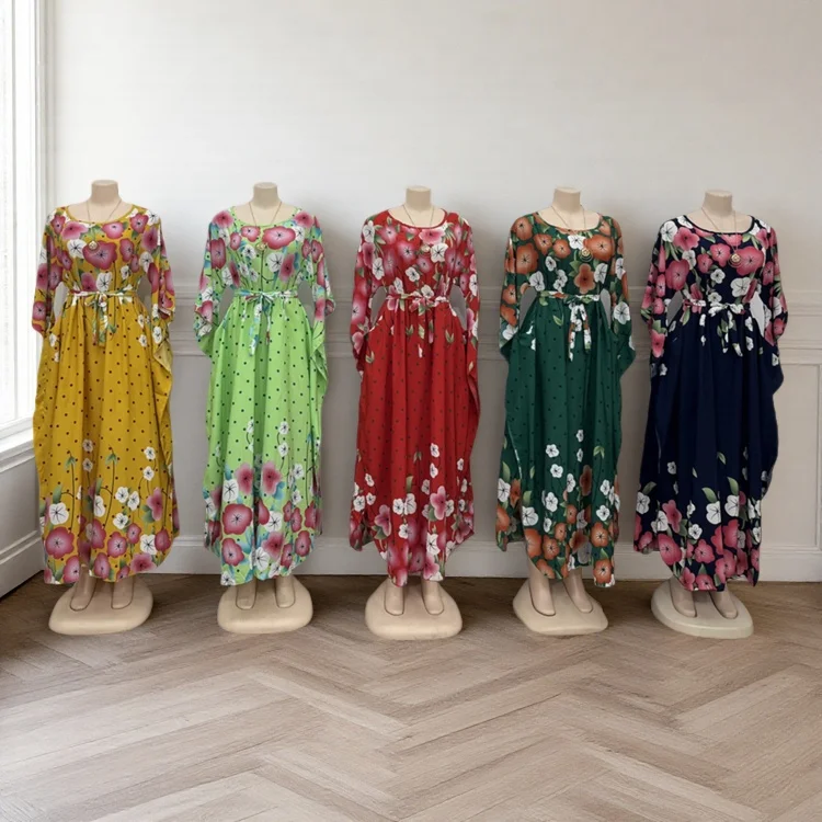 Wholesale New Summer Elegant Printed Casual Long Sleeve Round Neck Loose Muslim Robe Dress