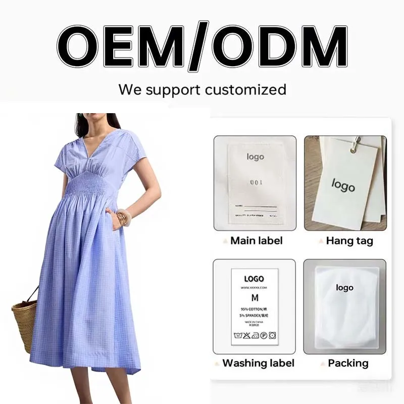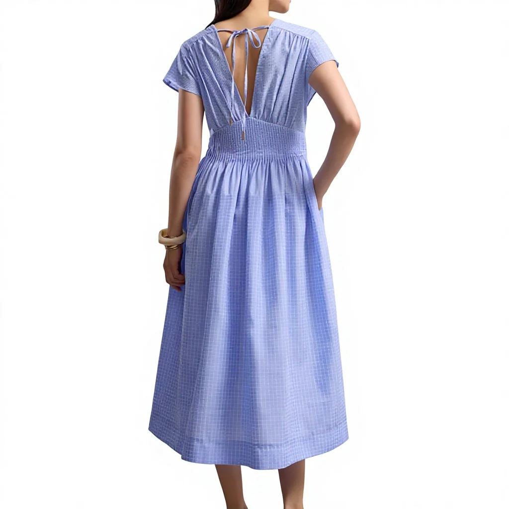 Casual Summer Style Lady Dress Elegant Gingham V-neck Cap Short Sleeve Fit & Flare Midi Fit Dress Women's Dresses