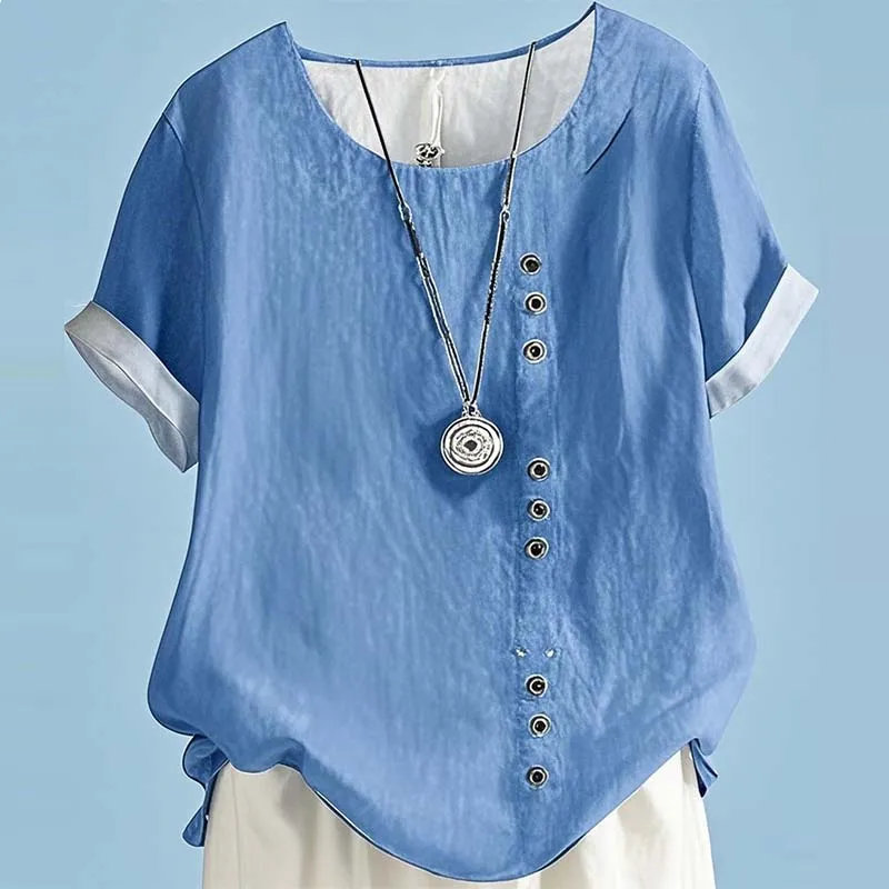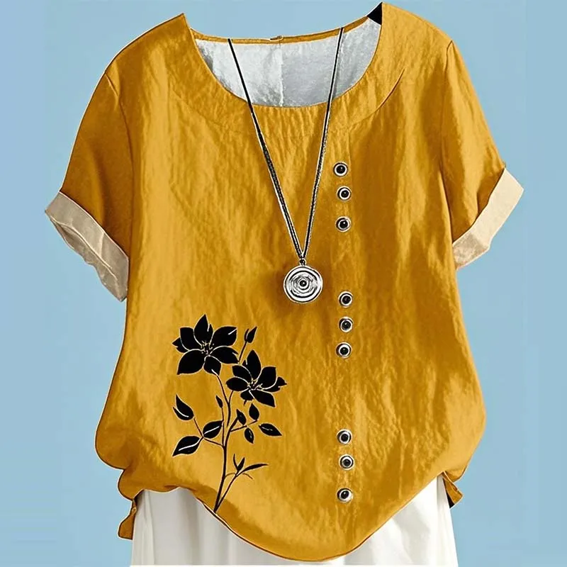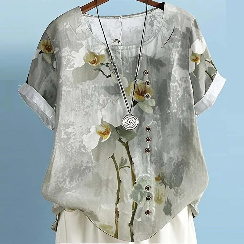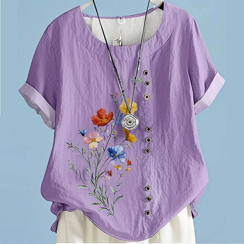 Women's Casual Elegant Floral Print Short Sleeve T-Shirt Crewneck Oversized Tops Lightweight Linen Cotton High Quality Basic Tee