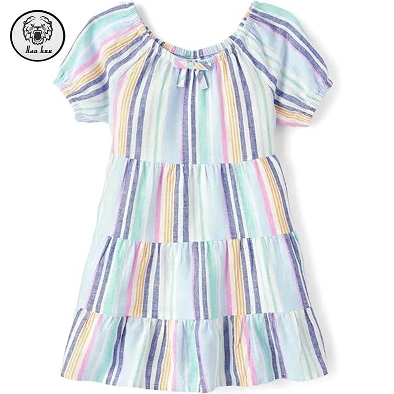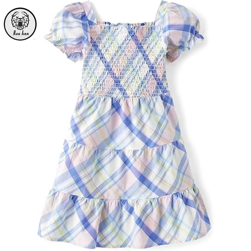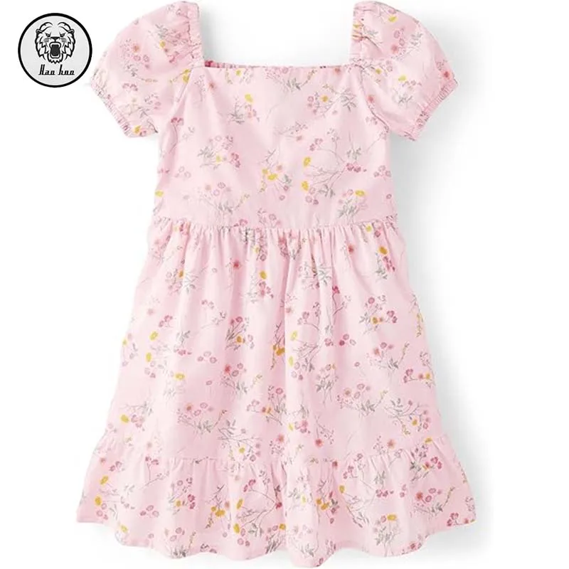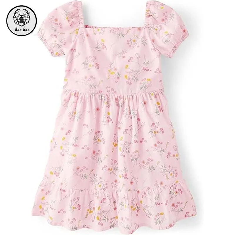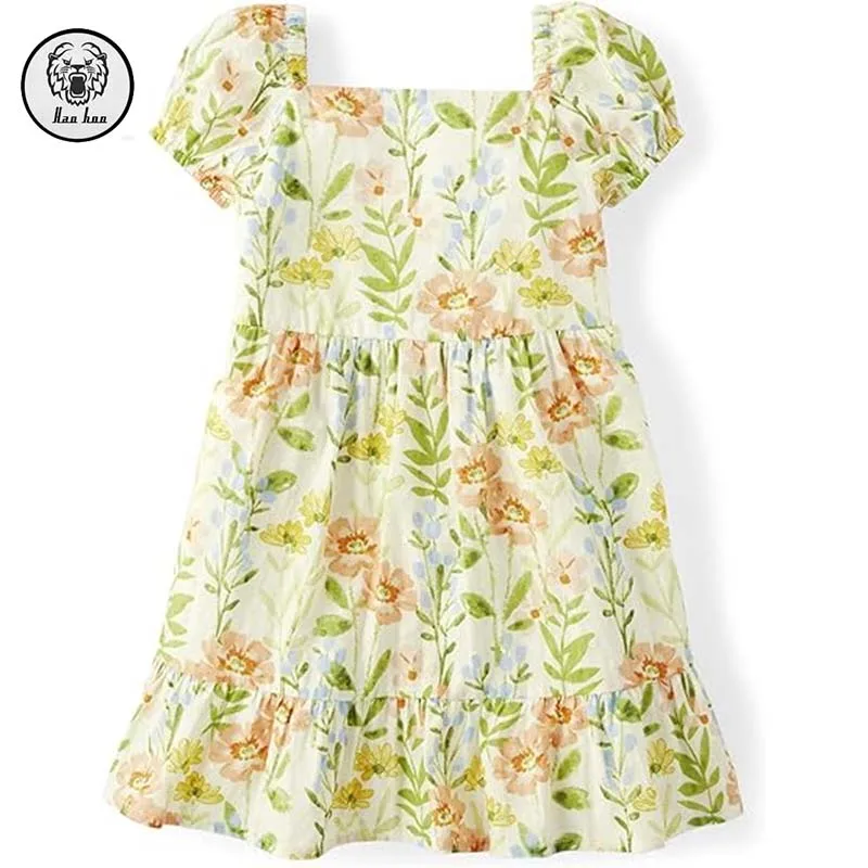 Girls' Toddler Puff Short Sleeve Floral Printing Dress Elasticized Scoop Neck Square Collar Zipper Draped Dress for Summer