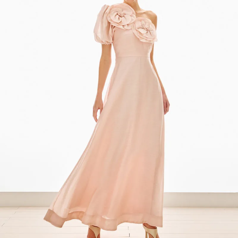 ZYHT 73903 Gemstone Crystal 3D Flower Decoration Ruched One Shoulder High Slit Long Sleeve Maxi Simple Elegant Evening Dress