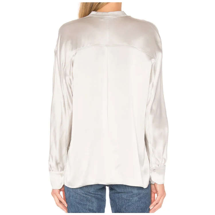 Elegant Women Clothing Front Patch Pocket 100% Satin Blouse With Three Quarter Sleeves Office Shirt