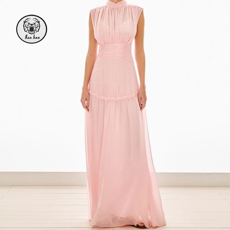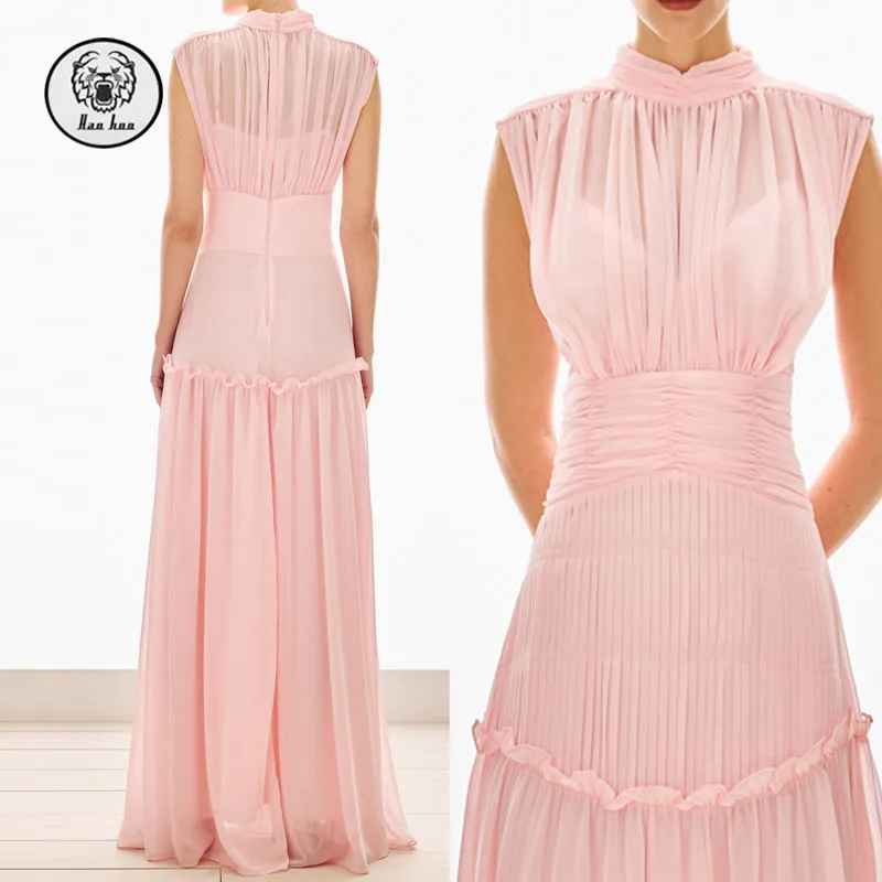 New Fashion High Neck Ruffle Trim Sleeveless Casual Summer Comfy Clothing Women Elegant Pink Maxi Dresses
