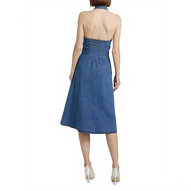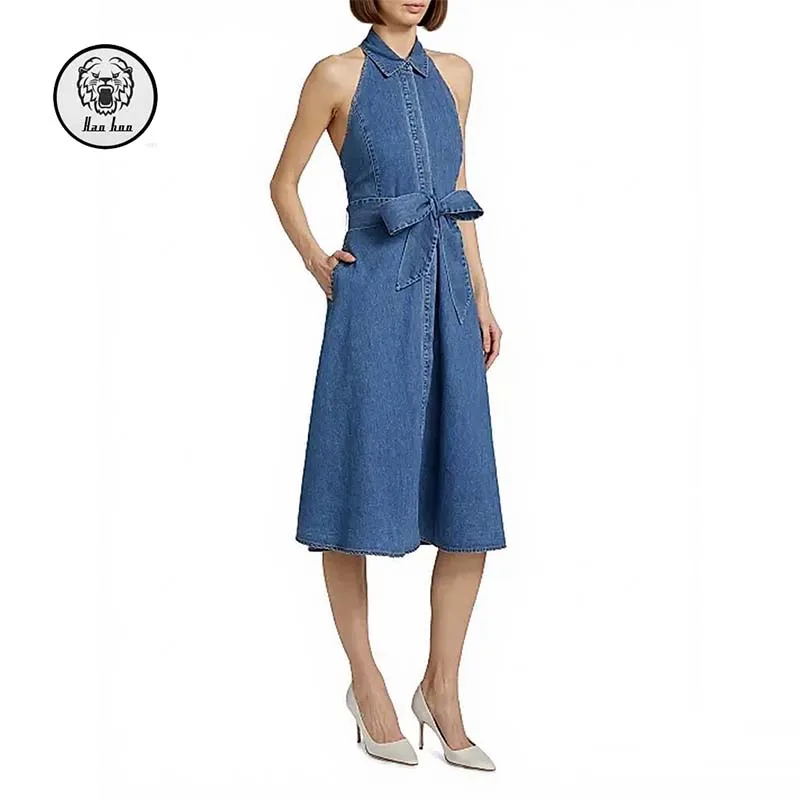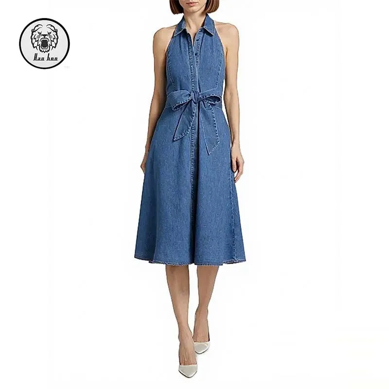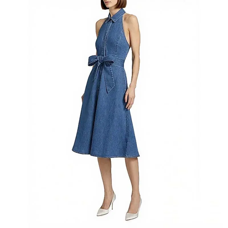 Wholesale Womens Summer Casual Empire Belt Halter Midi Denim Dress Button-Down Sleeveless with Pockets Maxi Length