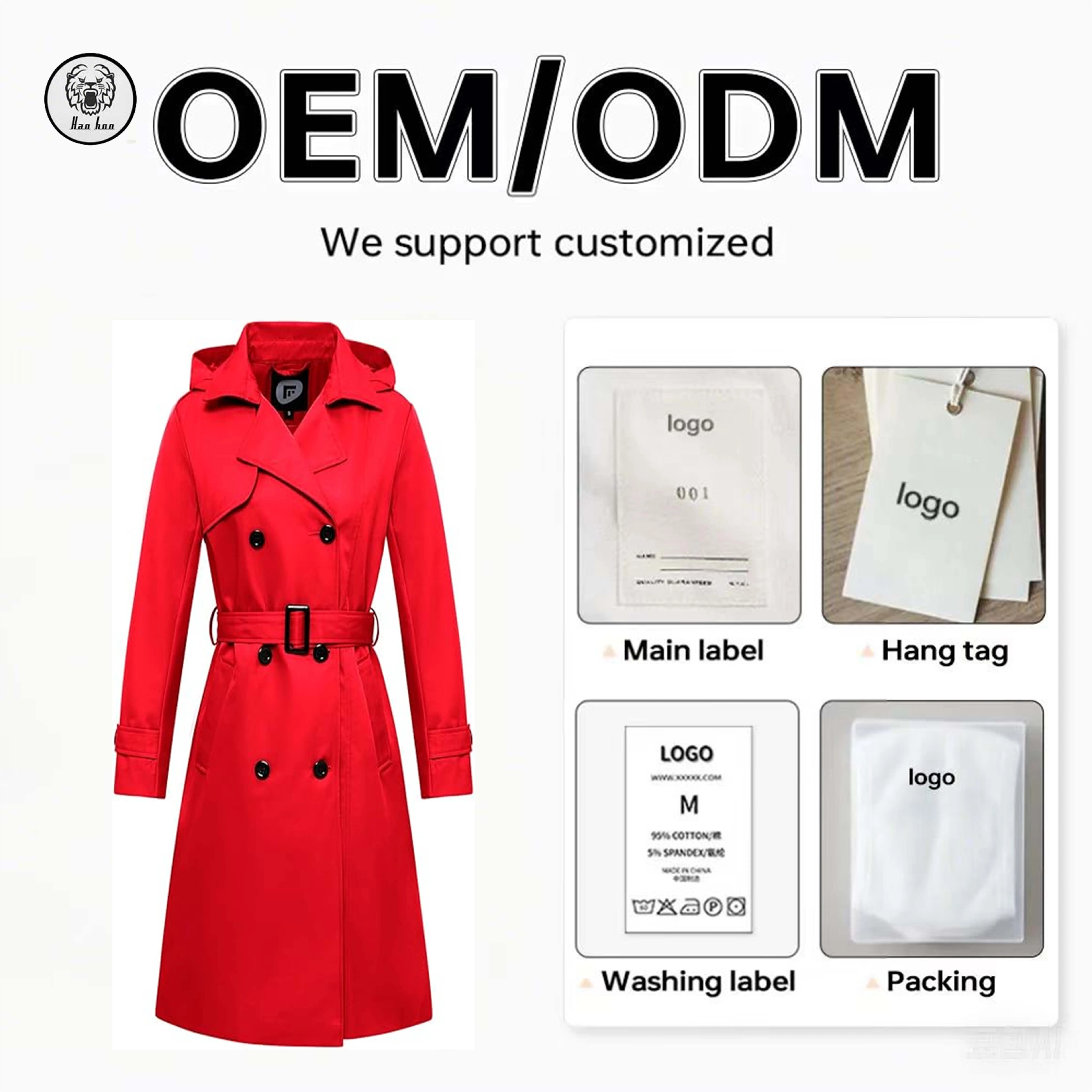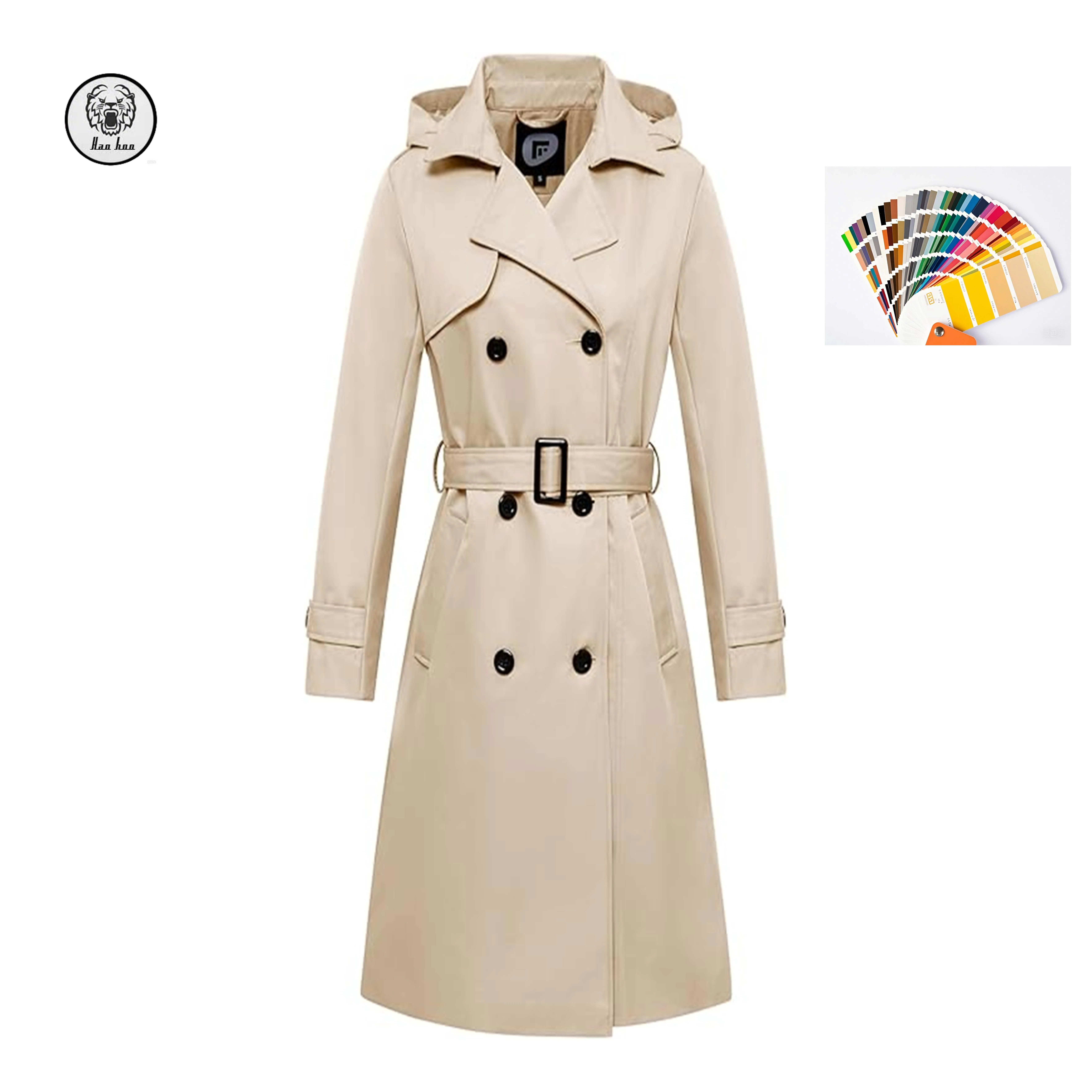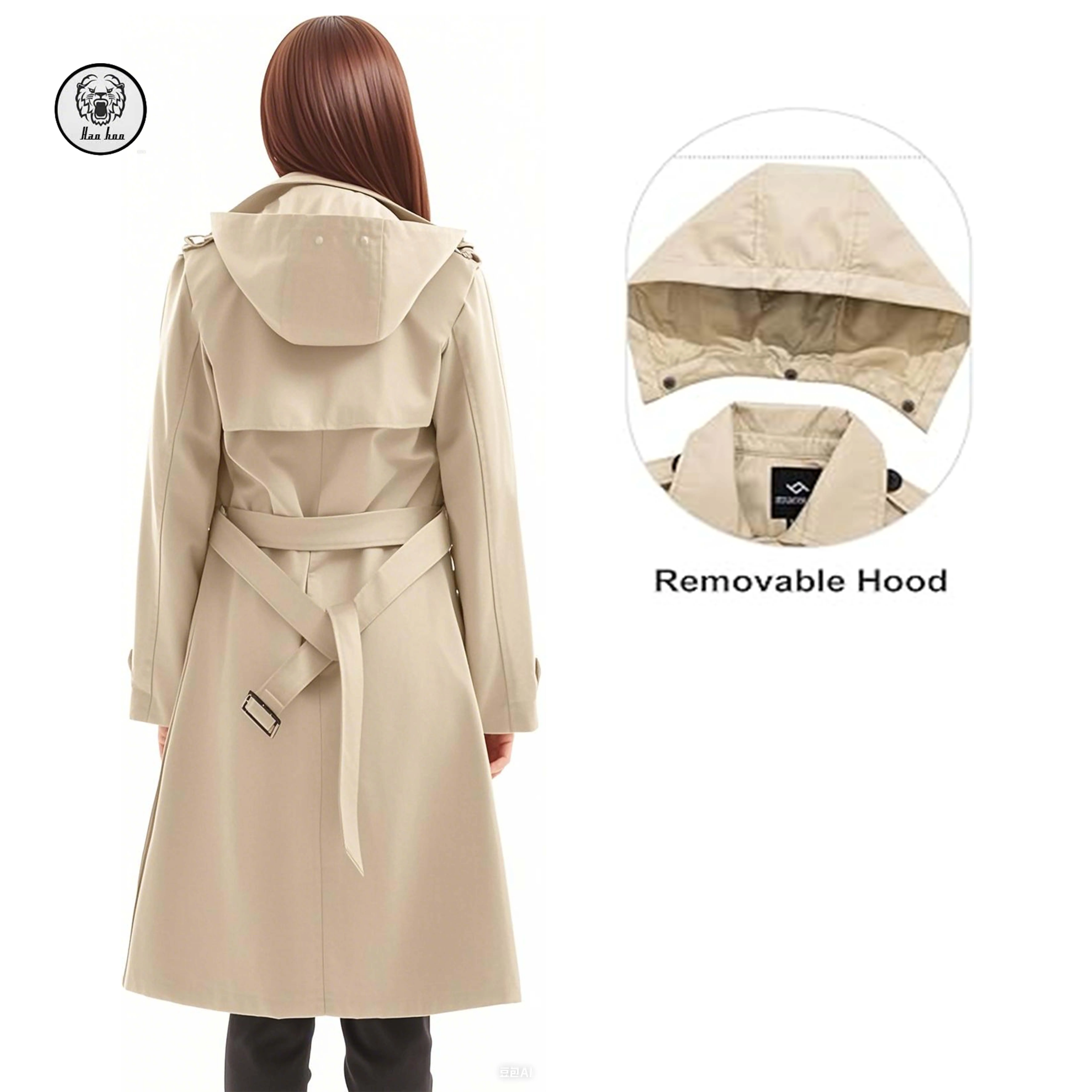Women's Vintage Long Waterproof Trench Dress Double Breasted Classic Lapel Dress Belted with Detachable Hood