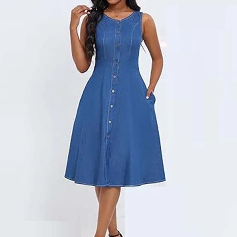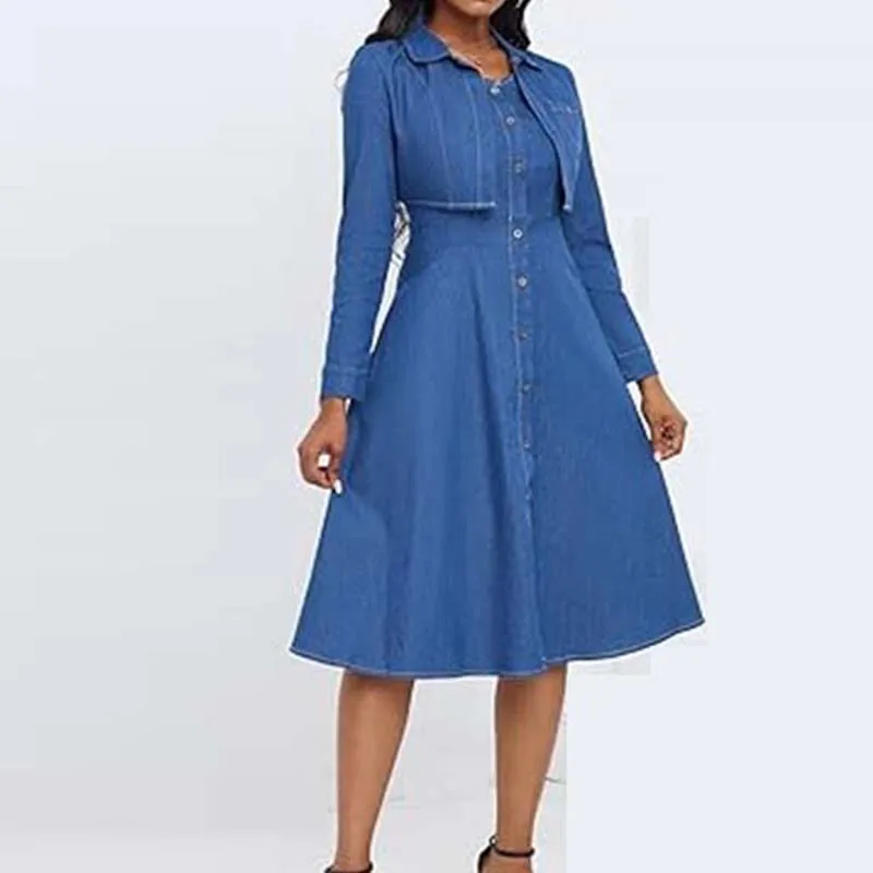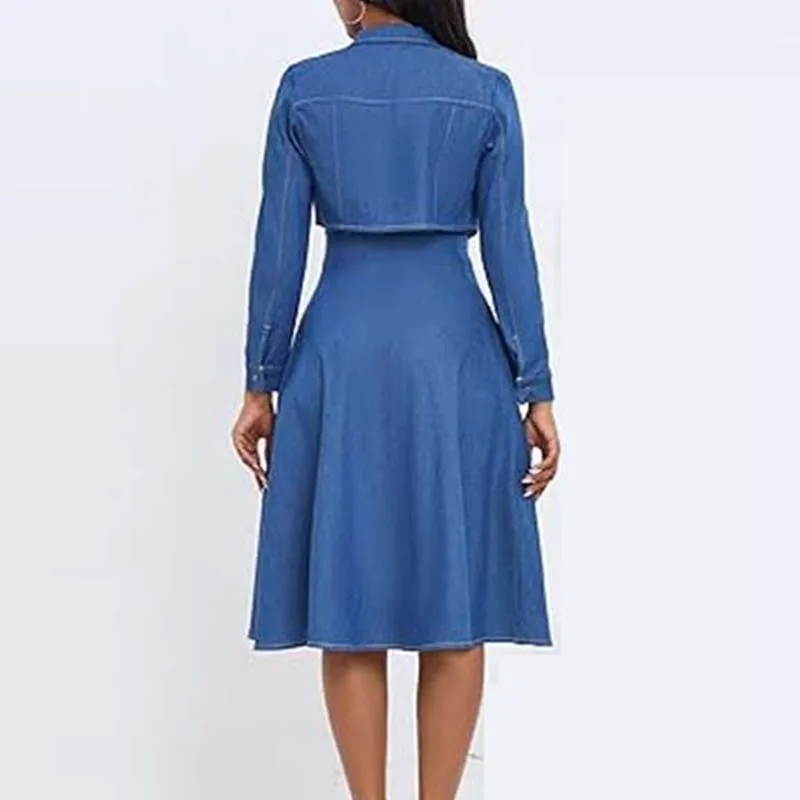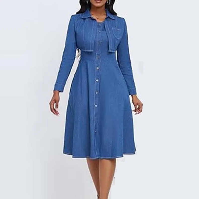 Two Pieces Vintage Elegent Denim Dress with Jackets Midi Dress Button Down Long Sleeve Shirt Dress Outfits for Party Daily