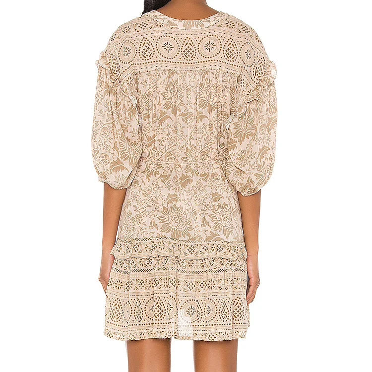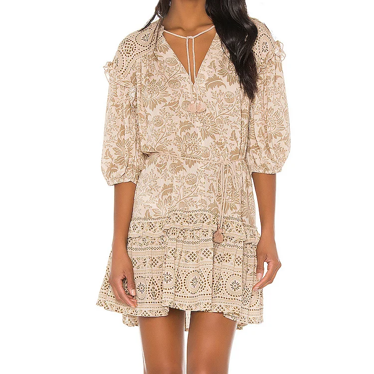 Wholesale Ladies Casual V-Neck Bohemian Style Mini Dress Floral Eyelet Tie Waist with Breathable Tassels