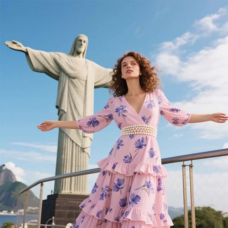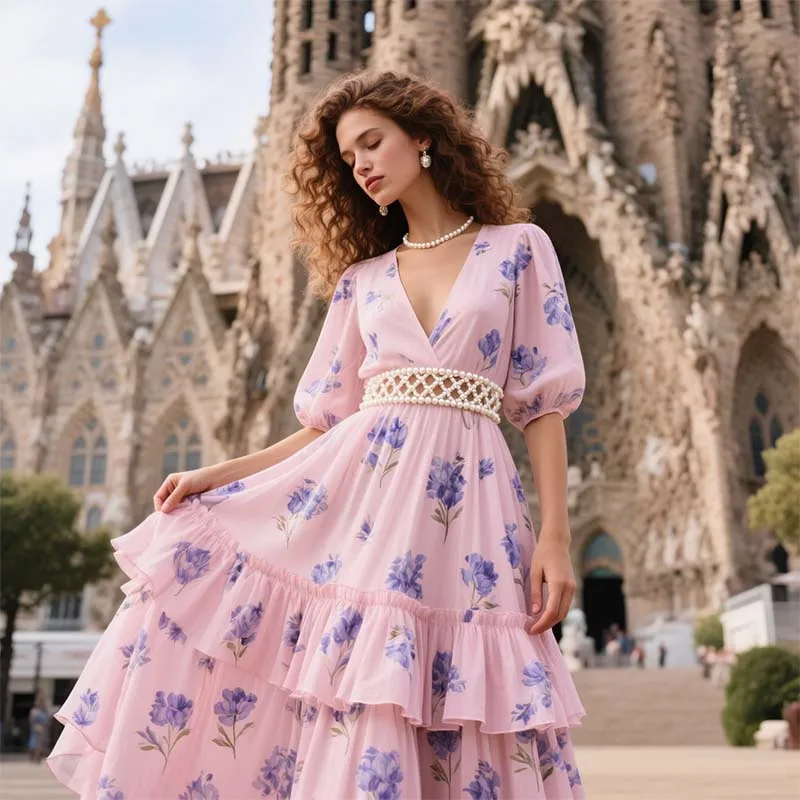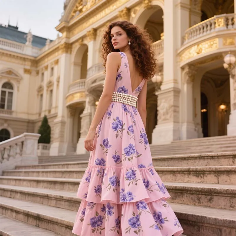 2026 Summer High Waisted Tiered Ruffle A-Line Dress Printed Cotton Linen V-Neck Zipper Draped Diamond Maxi Dresses