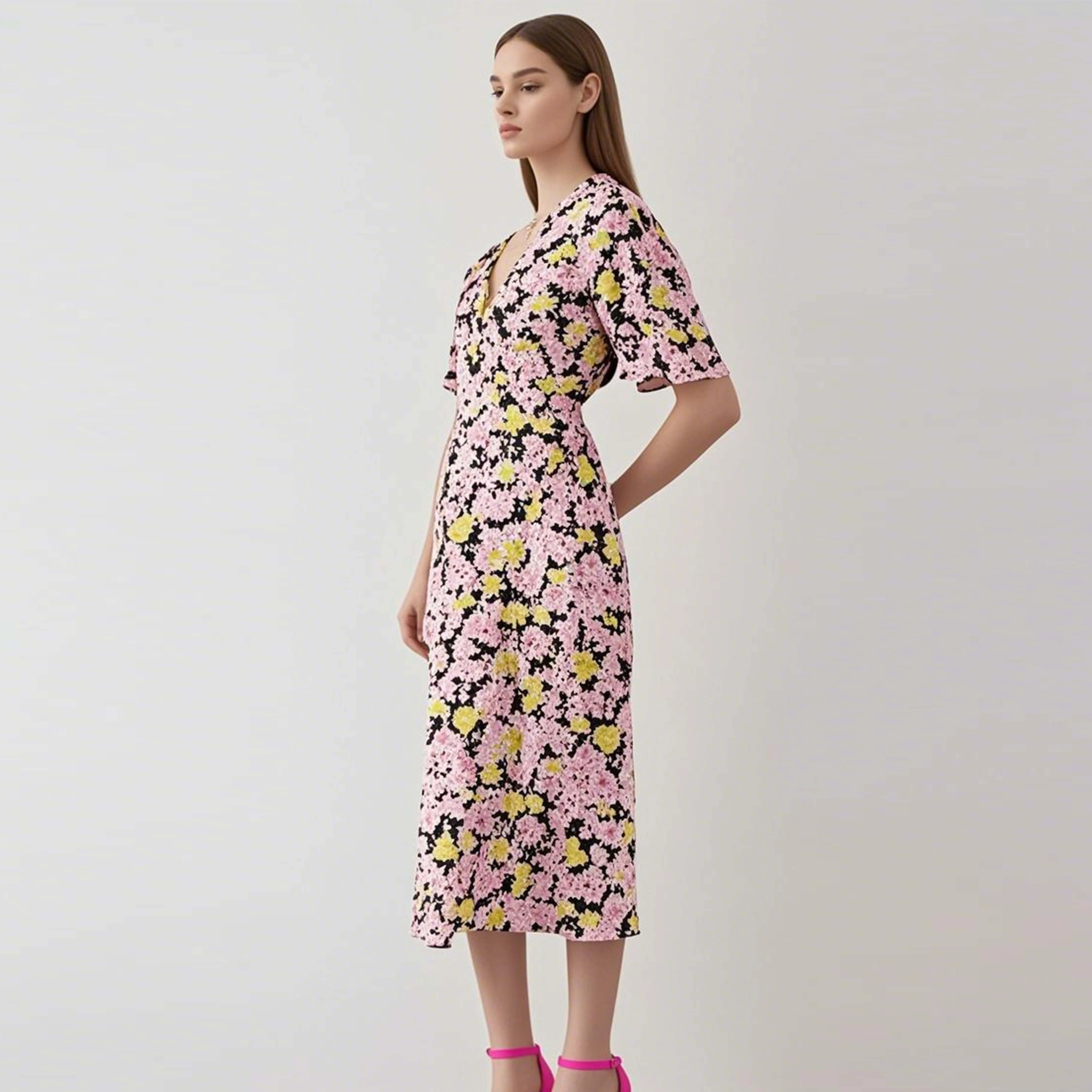 2026 Summer New Style Wholesale Pink Floral Flutter Sleeve Shirred Waist Daily Chic Midi Women Dress