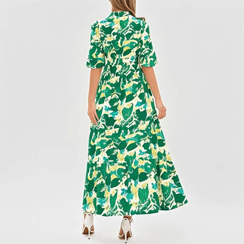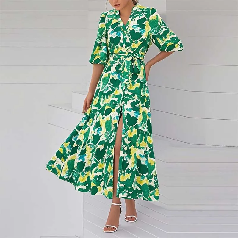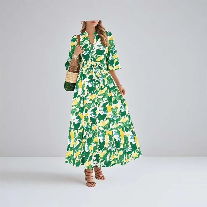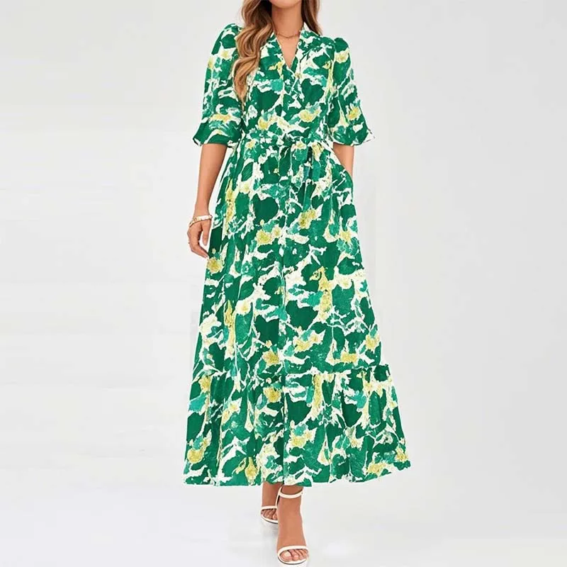 Women's Summer Casual Boho Floral Chiffon Maxi Dress V Neck 3/4 Puff Sleeve Button Tie Waist Long Flowy Shirt Dress
