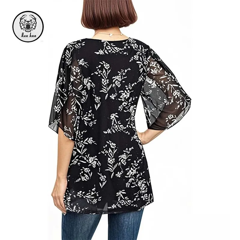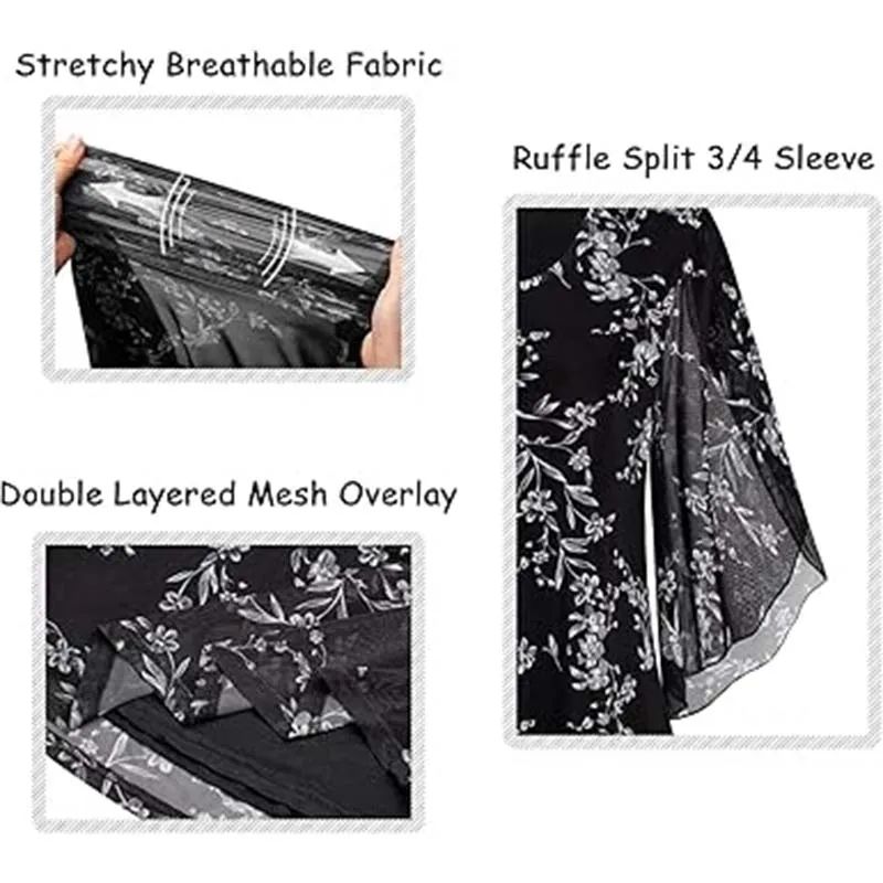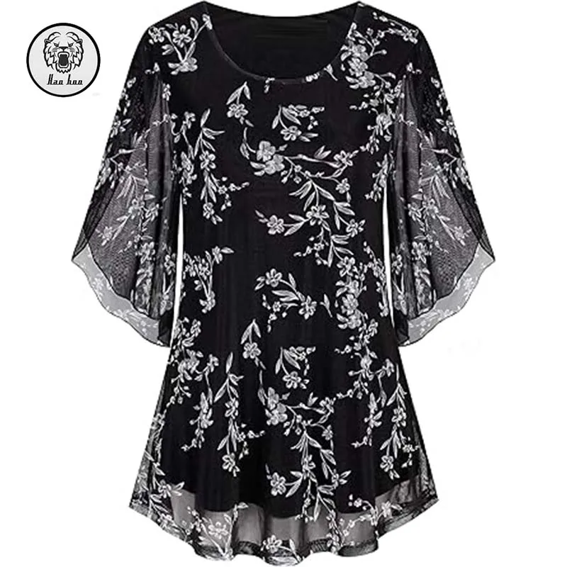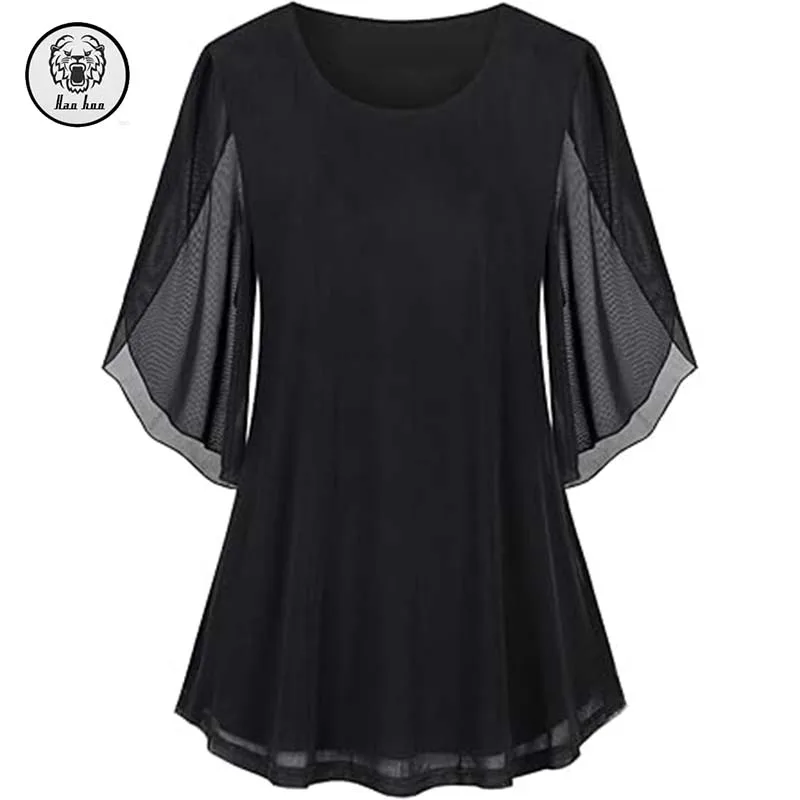 Women's Double-Layered 3/4 Sleeve Blouses Solid Mesh Tunic Shirts with Front Logo Dressy Casual One-Piece Tops