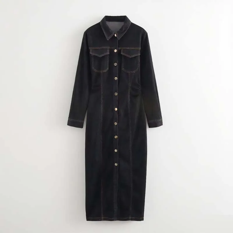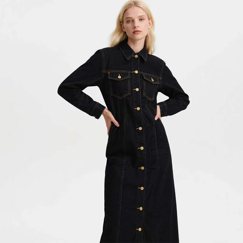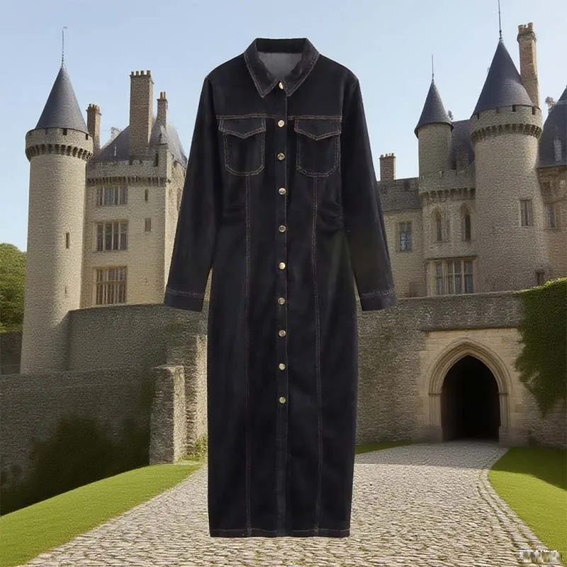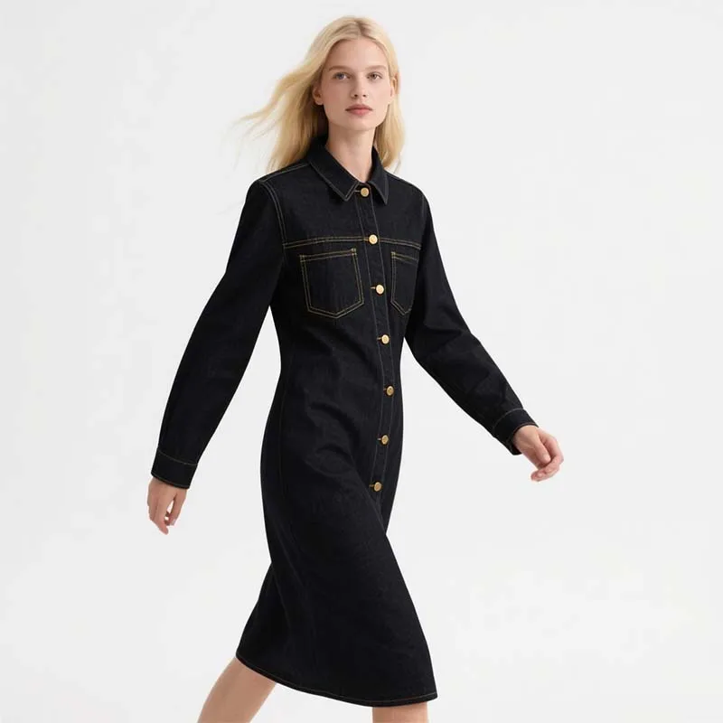 Women's 2026 Spring Collection New Casual Long-Sleeved Midi Dress Pocket Decoration Natural Straight Skirt Versatile