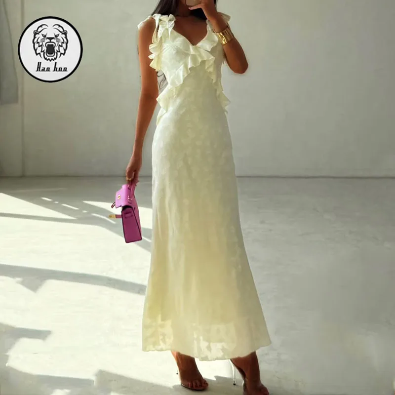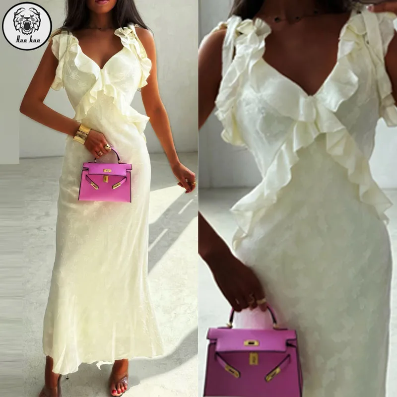 Latest Design V-Neck Sleeveless Ruffle Full Lining Women Sexy Summer Casual Maxi Dresses