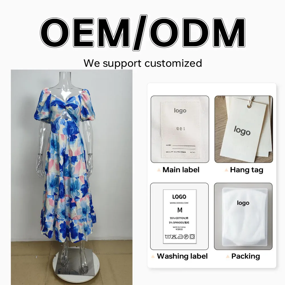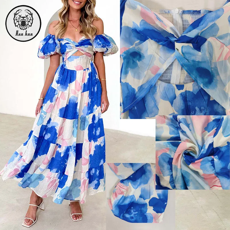 New Arrival Puff Short Sleeve Blue Floral Summer High Quality Clothes Women Casual Maxi Dresses