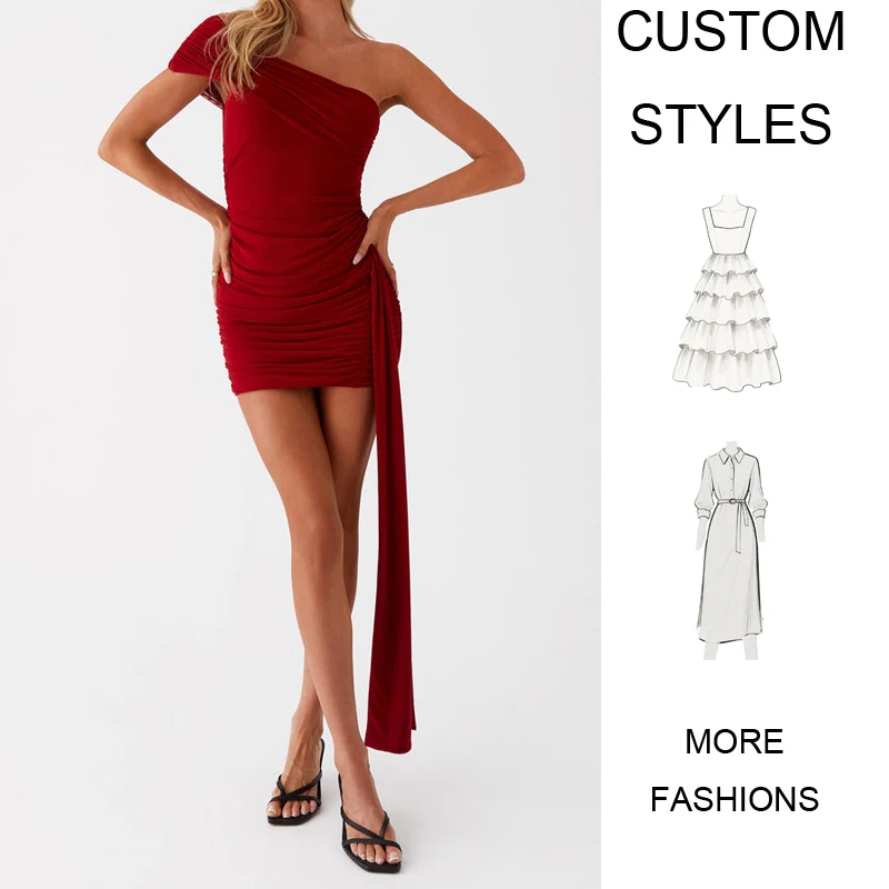 OEM Customizable Mini Dress Lady's Elegant Red One-Shoulder Ruched Party Sleeveless Woven Summer Apparel Sweet Asymmetrical