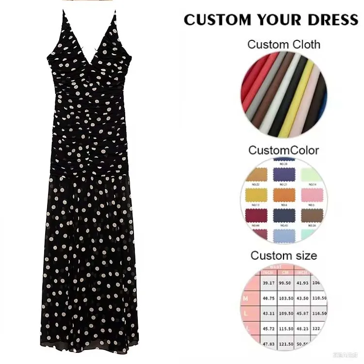 ODM Style Thin Cross-back Straps Party Long Dress Sexy Sleeveless Polka Dots Printed Draped Slim Maxi Dress for Women