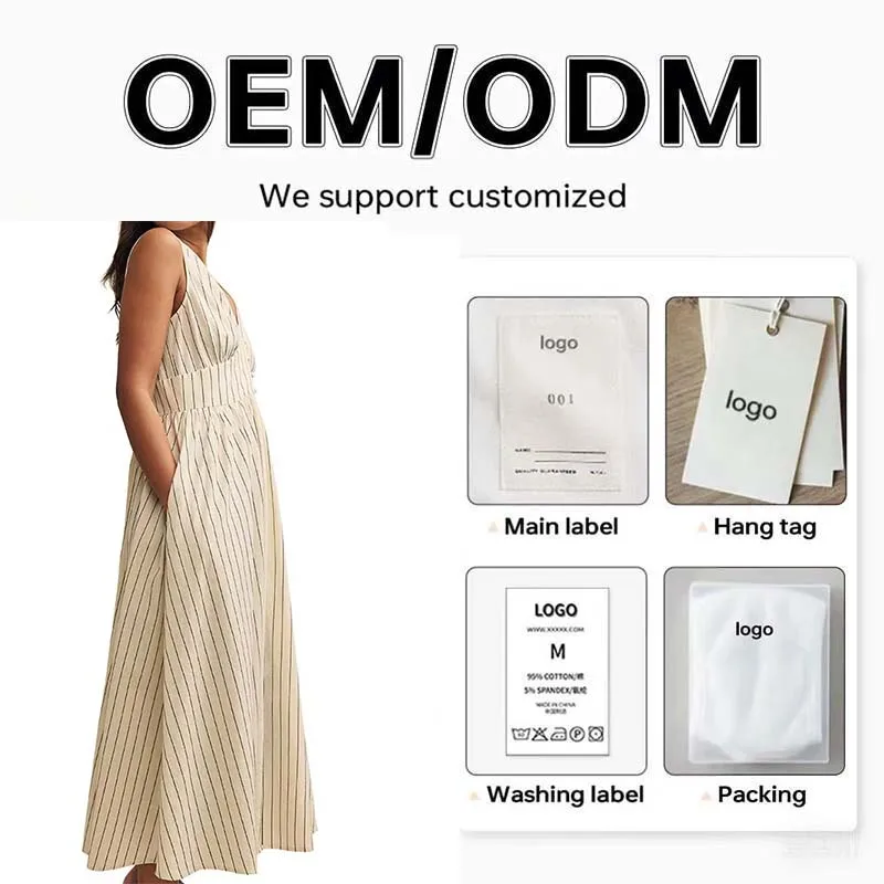 Casual Style Lady Office Dress V-neck Side Pockets Stripe Sleeveless Front Button Cotton Maxi Women's Dresses
