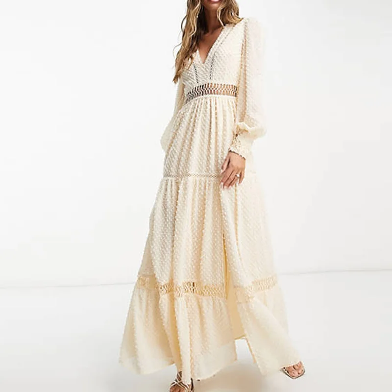 New Causal Design Women's V-neck Tufted Textured Lace Insert Long Sleeve Beige Tiered Maxi Dress