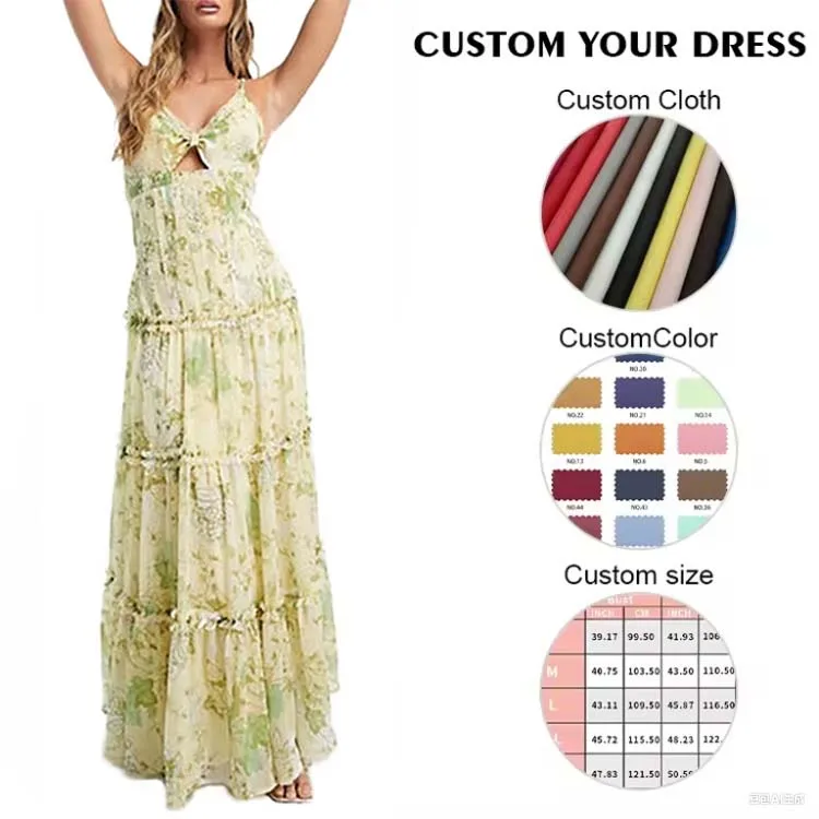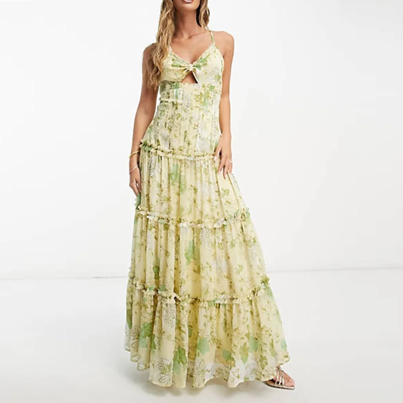 Women's V-Neck Halter Knot Front Cut-out Raw Edge Tiered Yellow Floral Print Maxi Flare Sundress
