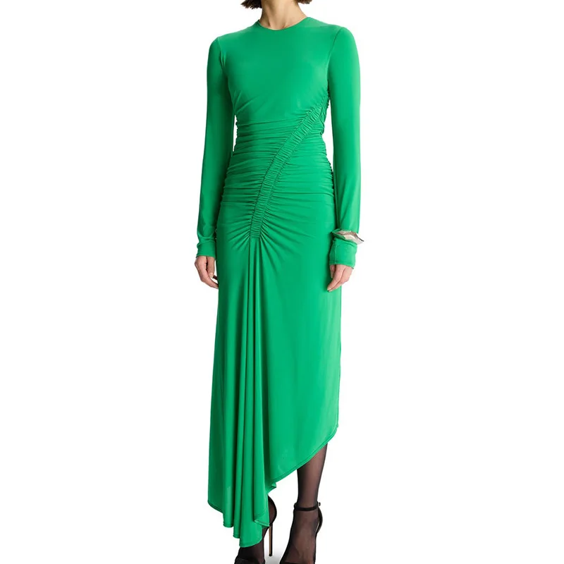 Fall Clothes Lady Elegant Dress Long Sleeve Asymmetric Hem Bodycon Shirring Casual Women Midi Dress