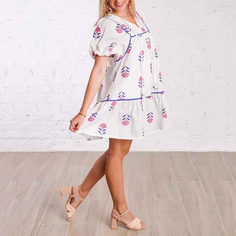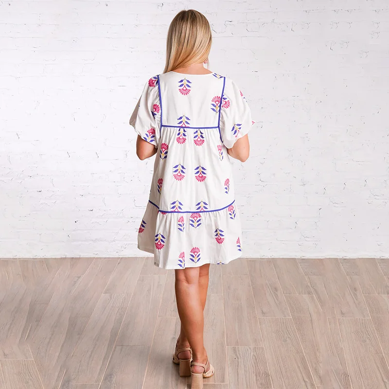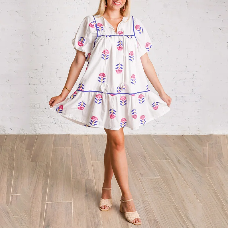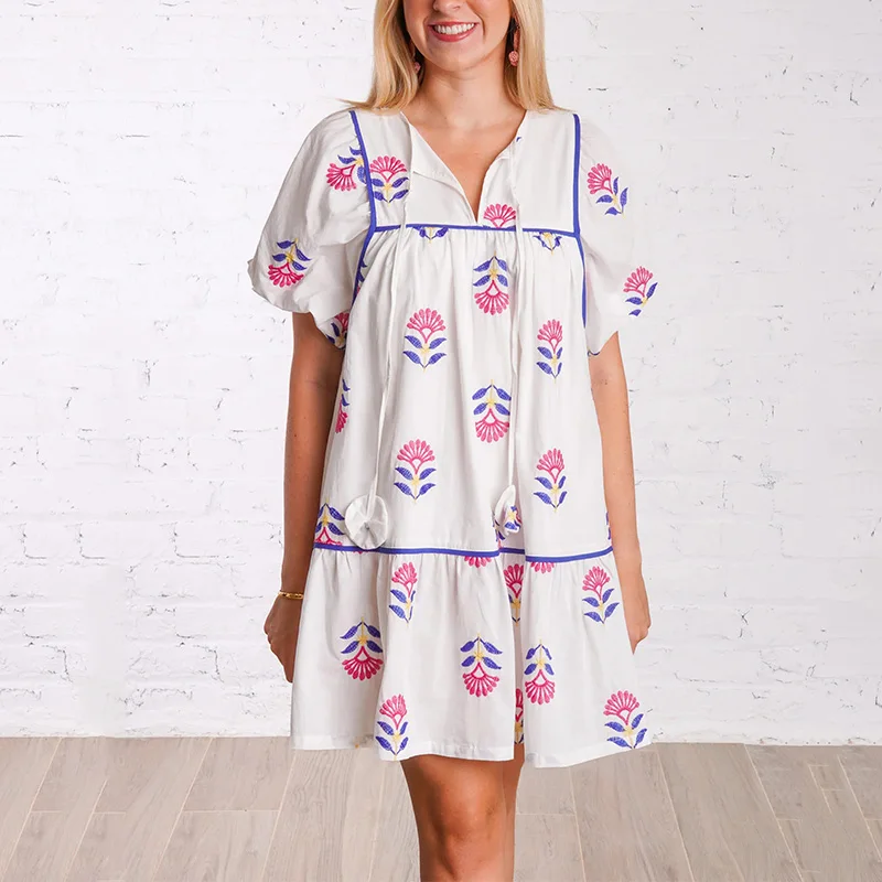 Summer Block Pattern Knee-length Dress Embroidery Mini Relaxed Dress