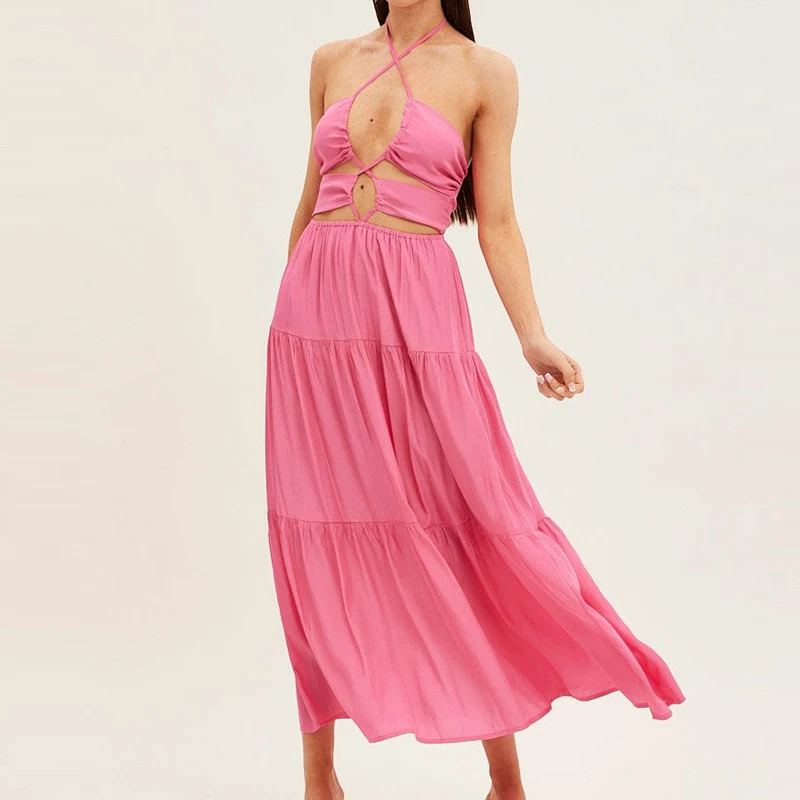 Custom Design Cut Out Backless Women Halter Pink Long Casual Maxi Sexy Dresses
