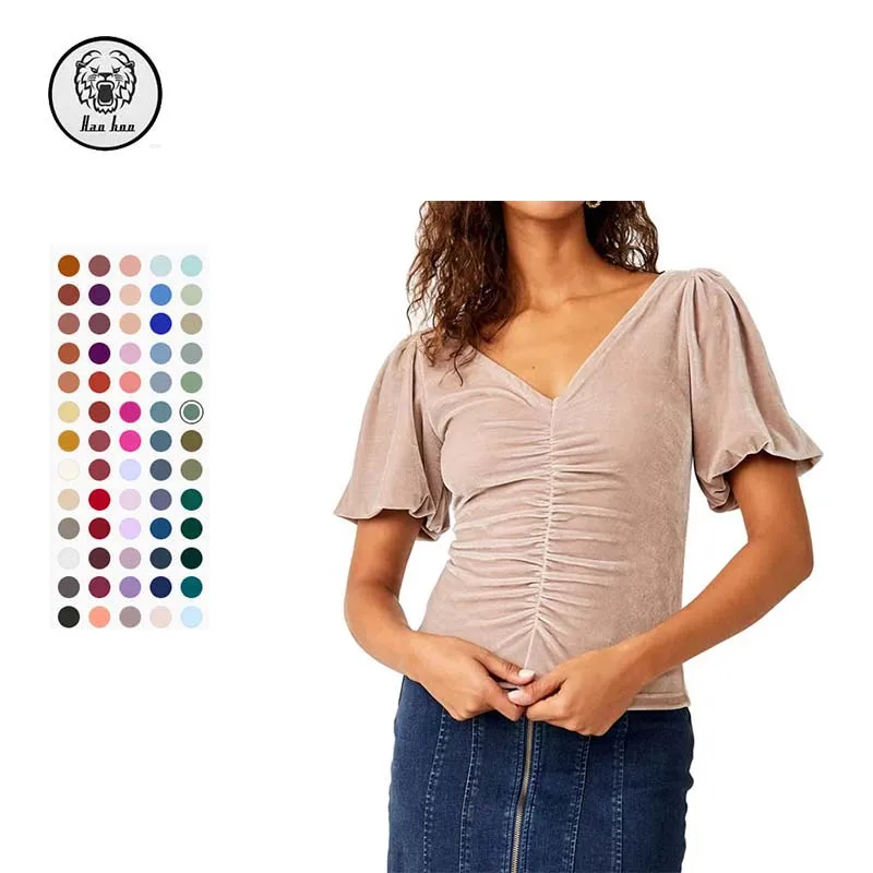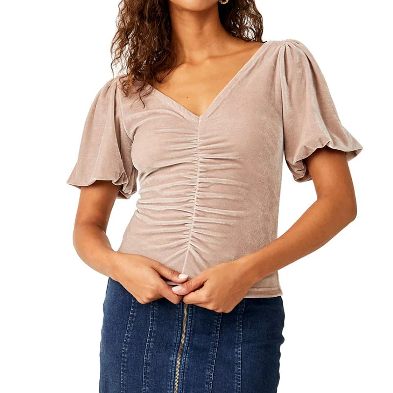 Spring Clothing Lady Elegant Tops V-Neck and V-back Puff Sleeves Slim Ruched Velvet Casual Crop Tops Women's Blouse