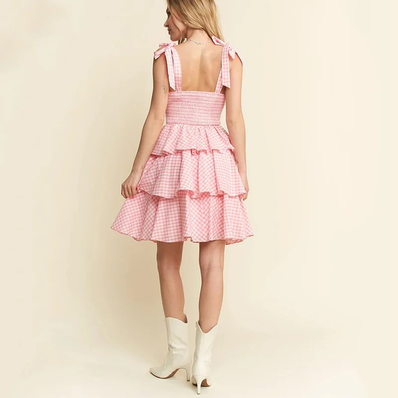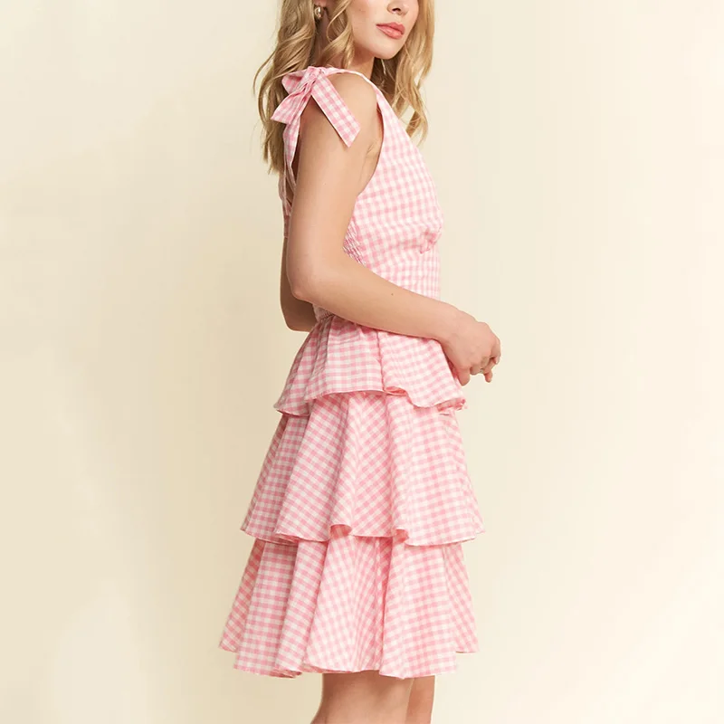 Summer Pink Gingham Tiered Mini Dress Knee Length Layered Dress Garden Parties Dress