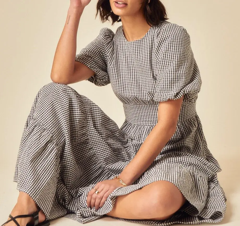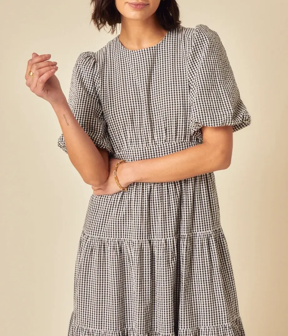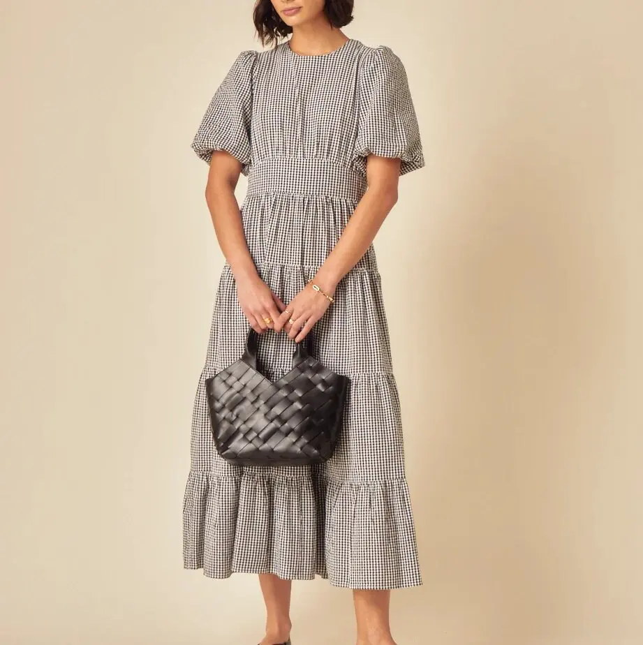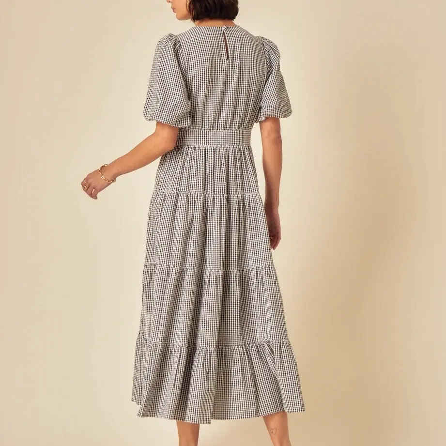 Women's Elegant Checkered O-Neck Casual Dress with Puff Sleeves OEM/ODM Service Available