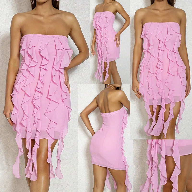 Custom High Quality Ruffle Slim Fit Sleeveless Pink Women Summer Casual Sexy Party Mini Dresses