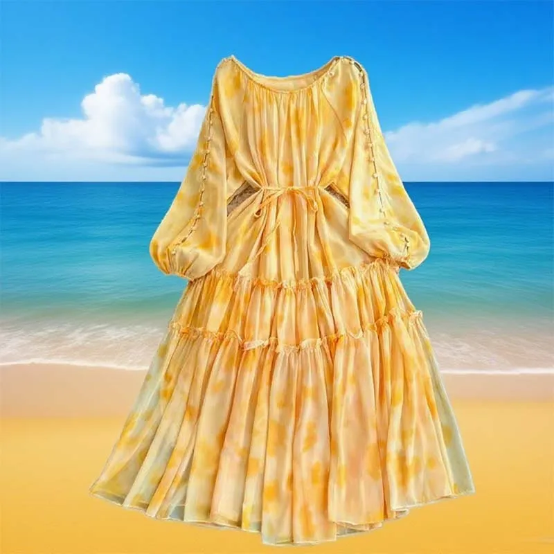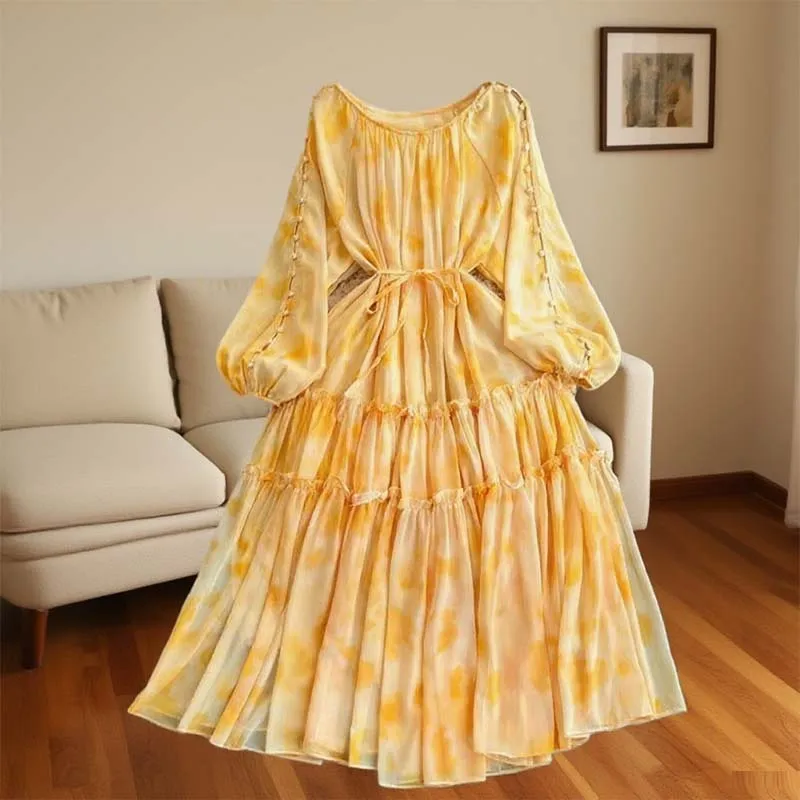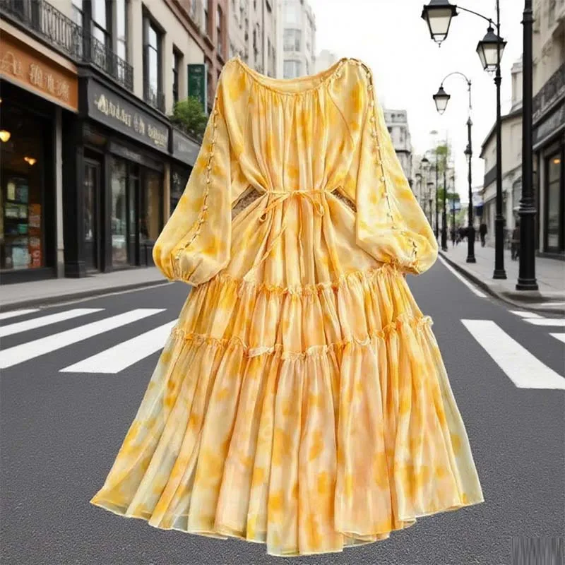 New Fashion Long Sleeve Printed Chiffon Dress Empire Waistline Ruched Decoration Solid Pattern Midi Length for Spring Autumn