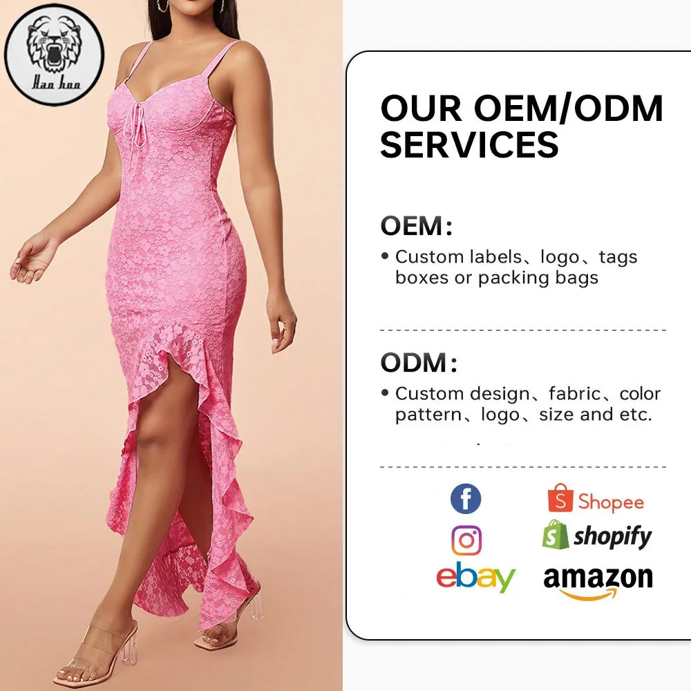 Custom Summer Fashion Pink Ruffle Bottom Lace Clothes Women Elegant Casual Bodycon Maxi Sexy Dresses