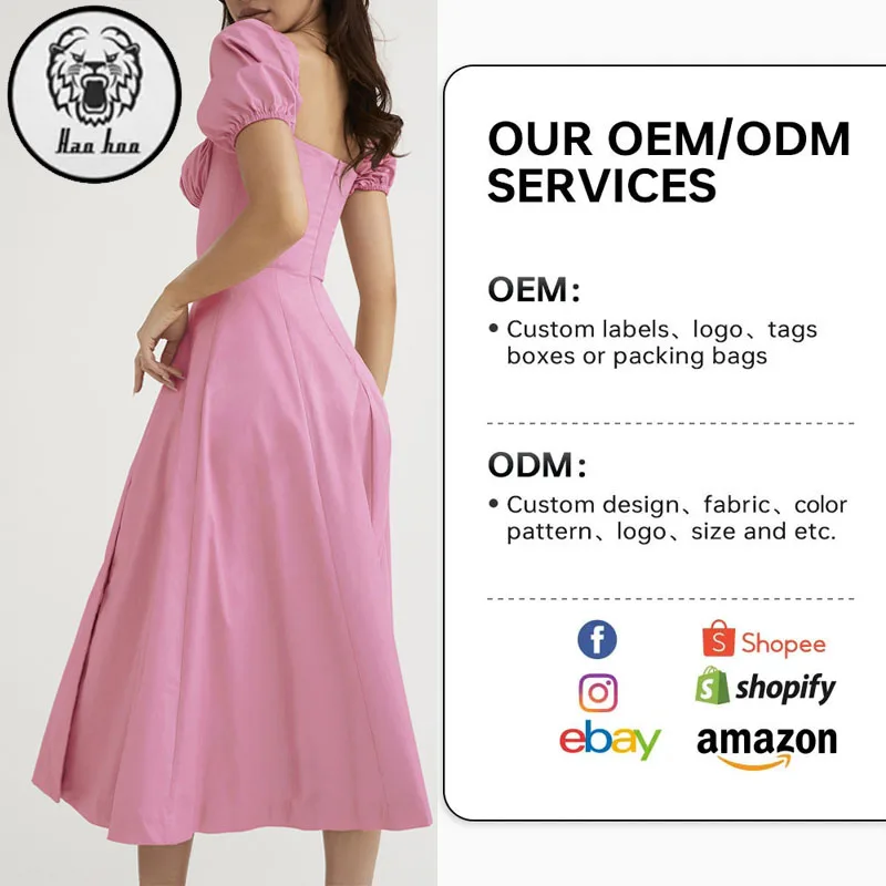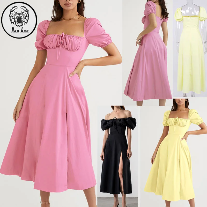 Custom Wholesale Party Elegant Puff Short Sleeve High Slit Pink Apparel Women Summer Casual Beach Dresses